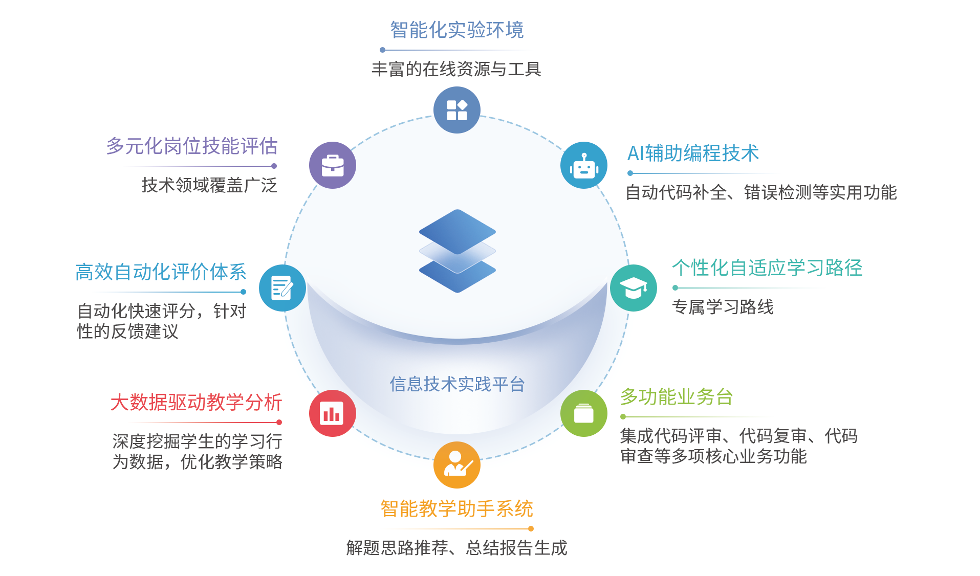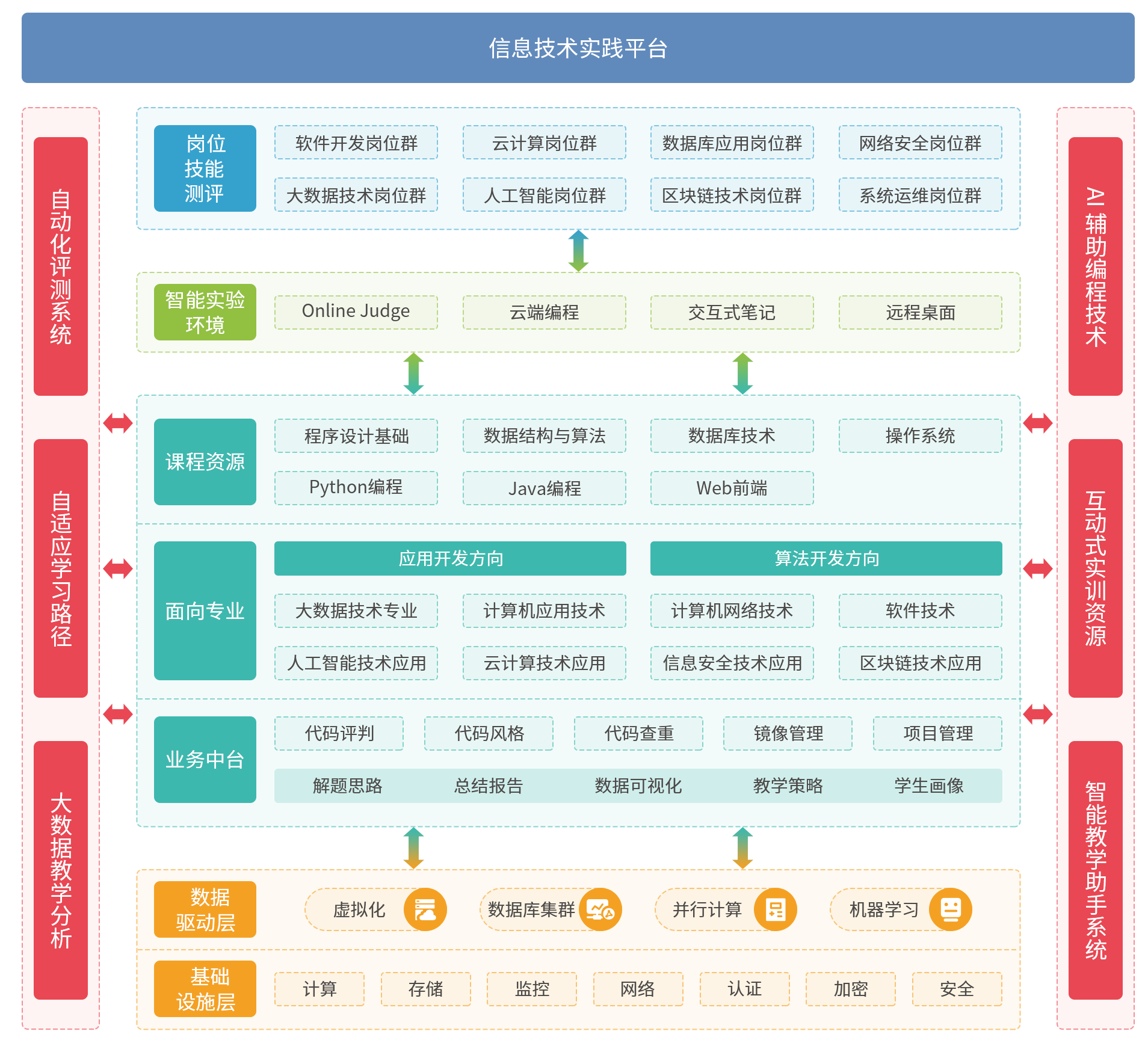信息技术实践平台以信息大类专业核心课程为基础,以自动测评为抓手,以学生实践能力培养为导向,建立创新实践能力项目库。围绕人工智能、大数据技术、软件开发、云计算、数据库应用等关键岗位群,模拟真实业务场景,通过自动化评测系统和智能化实验环境,强化学生的技术应用和项目管理能力。实践教学项目资源丰富,覆盖从基础学科到前沿技术,如算法设计与分析、软件工程、人工智能引论及大数据技术等。借助自适应学习路径推荐系统,鼓励学生根据个人职业规划和兴趣方向选择实训项目。