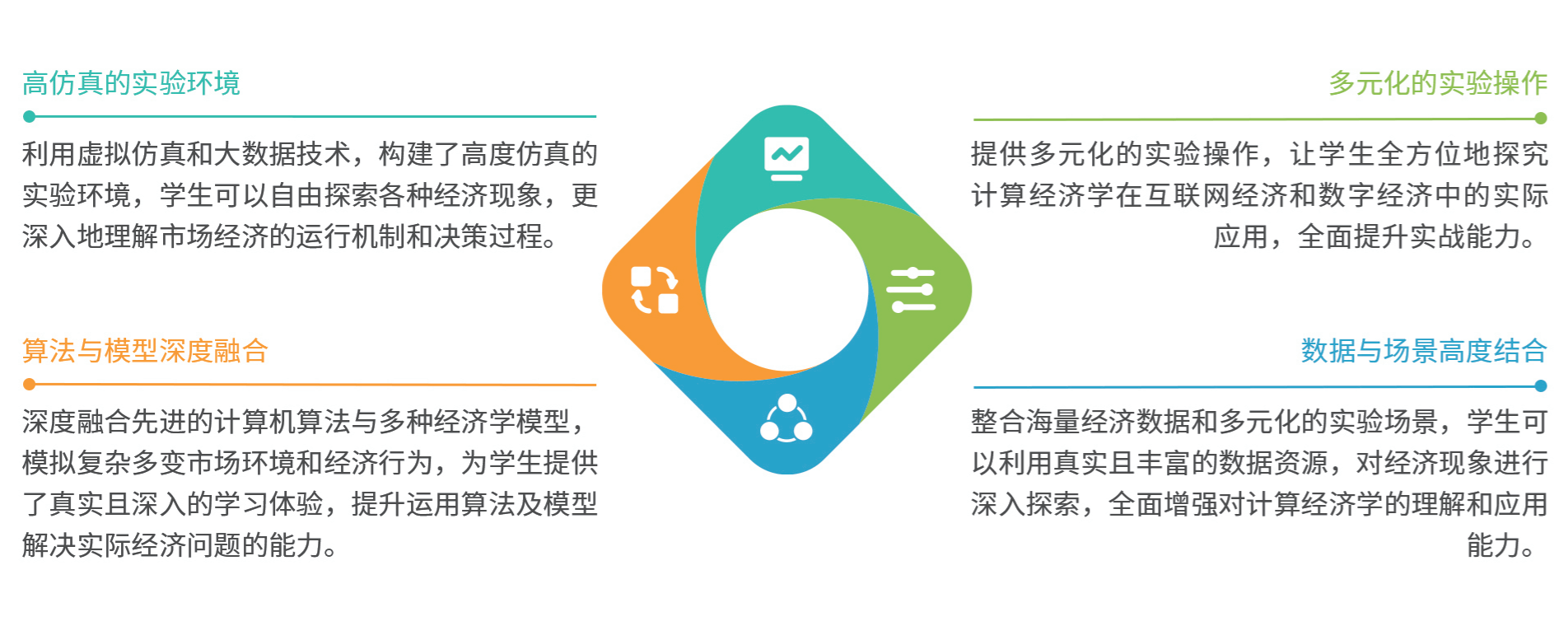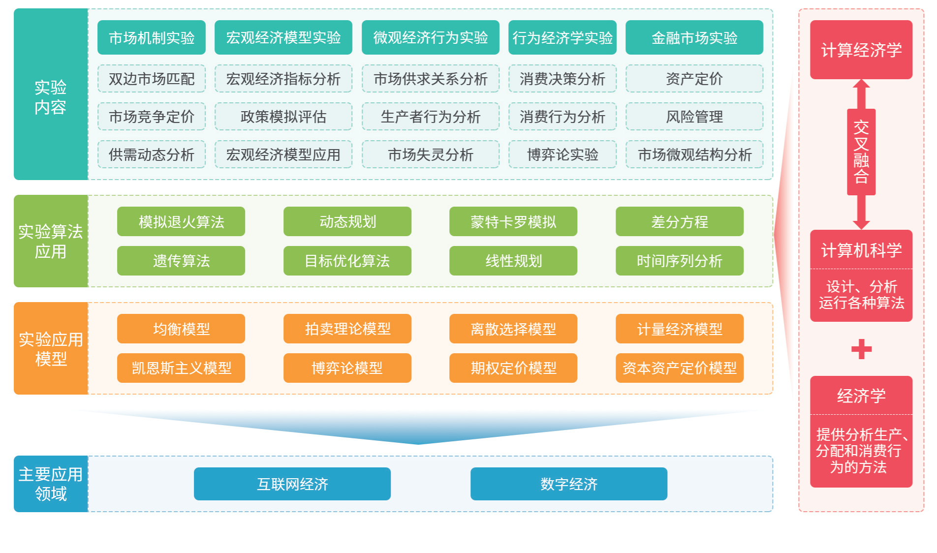 计算经济学实验顺应数字化人才培养趋势,聚焦计算经济学在互联网经济、数字经济中的应用,融入真实企业场景和岗位职责,运用虚拟仿真、大数据等先进技术,将计算机算法与经济学模型相融合,构建了高度仿真的经济环境,能够真实模拟互联网经济和数字经济条件下市场的动态变化、市场的运作及决策过程,学生可以进行市场机制实验、宏观经济模型实验、微观经济行为实验、行为经济学实验、金融市场实验等多元化的实验操作,在无风险的环境中切身体验市场决策过程,有效弥补了传统教学中理论与实践脱节的不足,有助于学生更好地适应数字化时代的发展需求,深入理解互联网经济、数字经济的运行规律,提升解决实际问题的能力,为未来从事相关领域的工作奠定坚实基础。