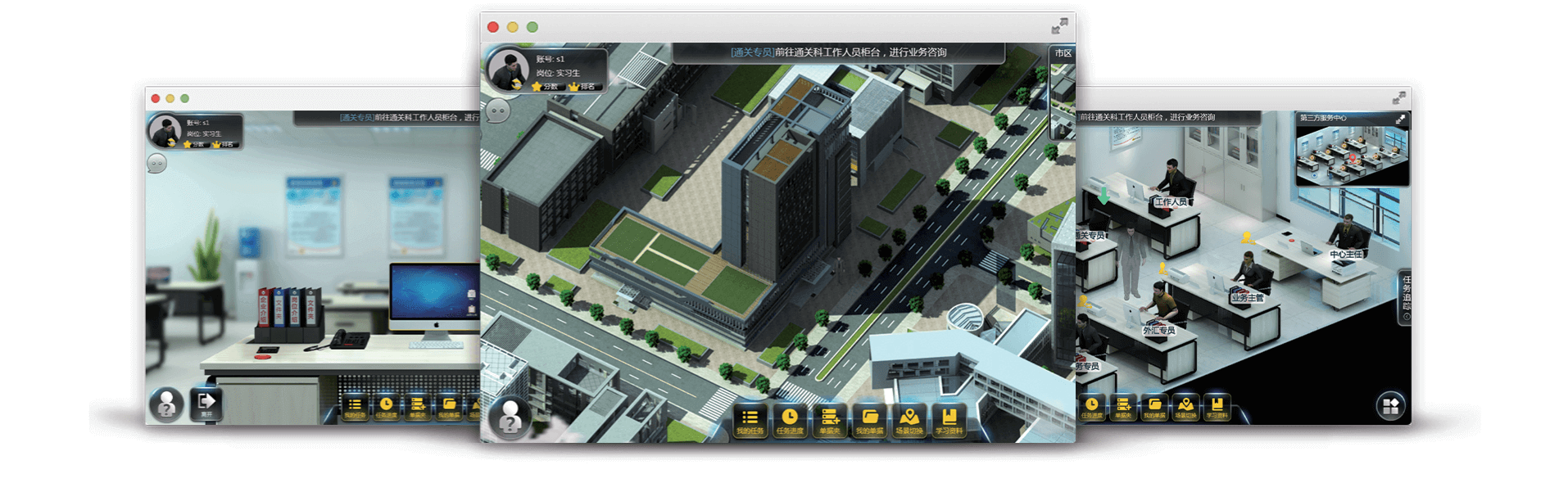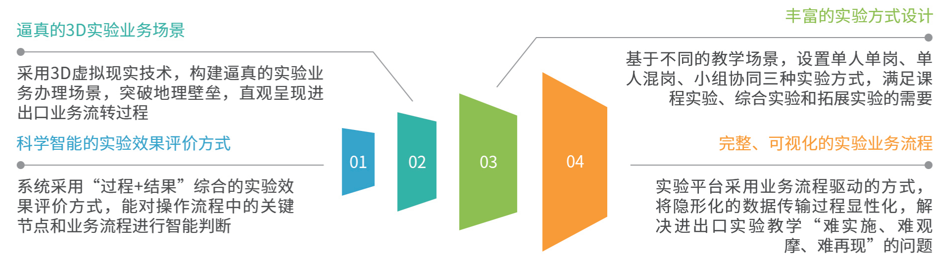跨境电商通关实验利用3D虚拟现实技术,按照跨境电子商务企业进出口真实业务处理的需求搭建海关、银行、税务、工商、检验检疫、物流公司等3D场景。基于跨境电子商务零售进出口9610、1210两种主要的监管方式和跨境电商进出口最新国家政策,立足进出口两个角度,采用典型工作任务流程驱动的方式,让学生利用角色转换、上岗操作、场景切换、单据填写、信息查询、签章等功能,完成业务主管、通关专员、外汇专员、税务专员、物流专员等五个工作岗位的实验任务。并基于不同的教学场景设置单人单岗、单人混岗、小组协同三种实验模式。通过场景化、沉浸式的实验训练,培养学生的跨境电商合规通关意识,提高学生进出口业务处理能力。