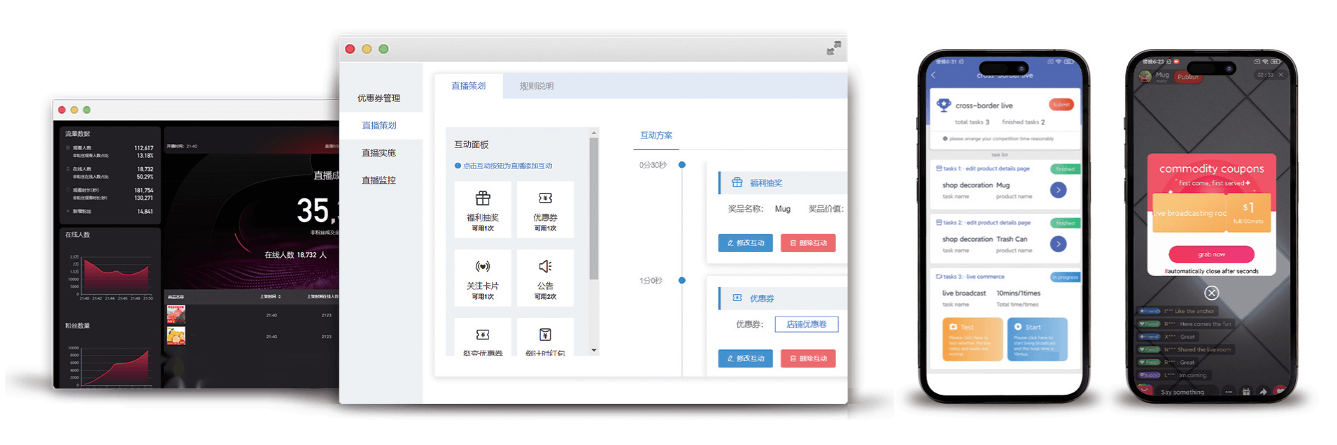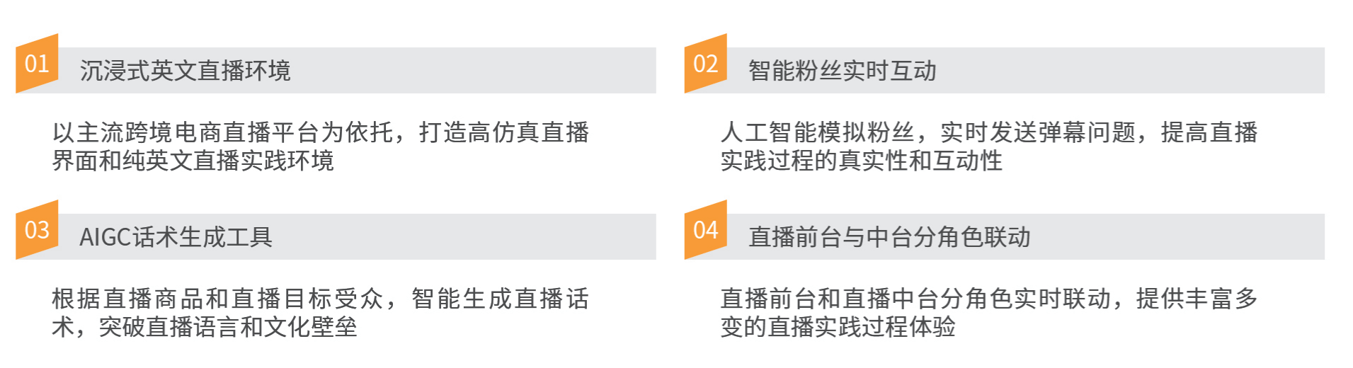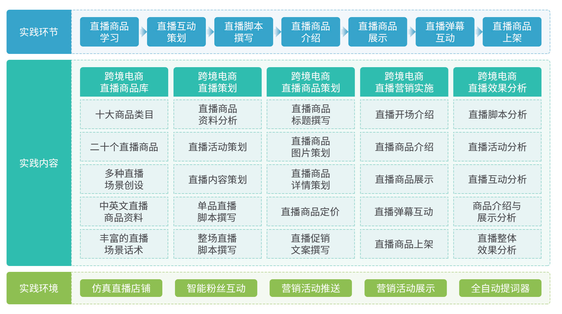 跨境电商直播营销实践紧跟跨境电商直播发展风向,以典型跨境电商直播平台为蓝本,聚焦跨境电商直播策划、直播运营、直播带货三大工作领域,根据不同工作内容特性,面向十个跨境电商热销类目,利用人工智能和虚拟仿真技术设计不同的实践场景。基于直播实施流程,借助AIGC技术生成多种互动场景、多种风格的讲解话术,突破跨境电商直播语言和文化壁垒。通过逼真的直播前台、中台工作环境构建,培养兼具直播策划能力、直播运营能力和直播营销能力的复合型、应用型专业人才。