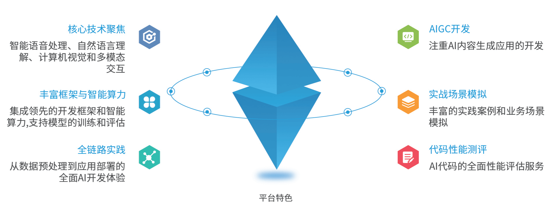 人工智能技术应用平台深度融合教学与实践活动,聚焦智能语音处理、自然语言理解、计算机视觉和多模态交互等AI核心技术的训练。中心配备了业界领先的开发框架和智能算力,用于机器学习与深度学习模型的训练和评估。实践中心通过AI训练框架和大模型底座,打造了涵盖数据预处理、模型选择、微调到应用部署的全链路AI开发实践体验,尤其注重AIGC应用开发体验。中心拥有丰富的项目实践案例,模拟真实的业务场景,结合全面性能测评服务,为人工智能领域培养具备实战经验的专业人才。