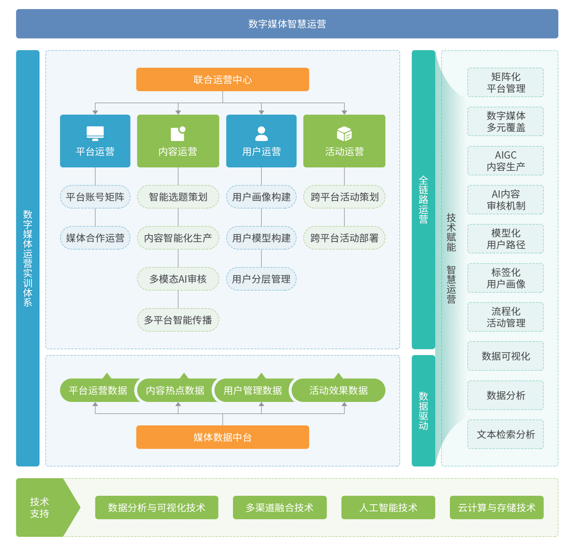 数字媒体智慧运营实验以数字媒体技能图谱为核心统一运营管理,整合平台、内容、用户及活动运营策略。数字媒体智慧运营实验采用数据分析与可视化技术建立数据中台,助力学员精准决策,并通过多渠道融合技术实现跨媒体内容智能分发和多元化运营,同时融入人工智能技术特别是AIGC,革新内容创作与审核流程,大幅提升效率并确保内容质量和合规性数字媒体智慧运营实验以一体化、智能化的特点,构建了数字媒体运营全方位实验框架,引领高效智能的数字媒体新型技能人才培养。