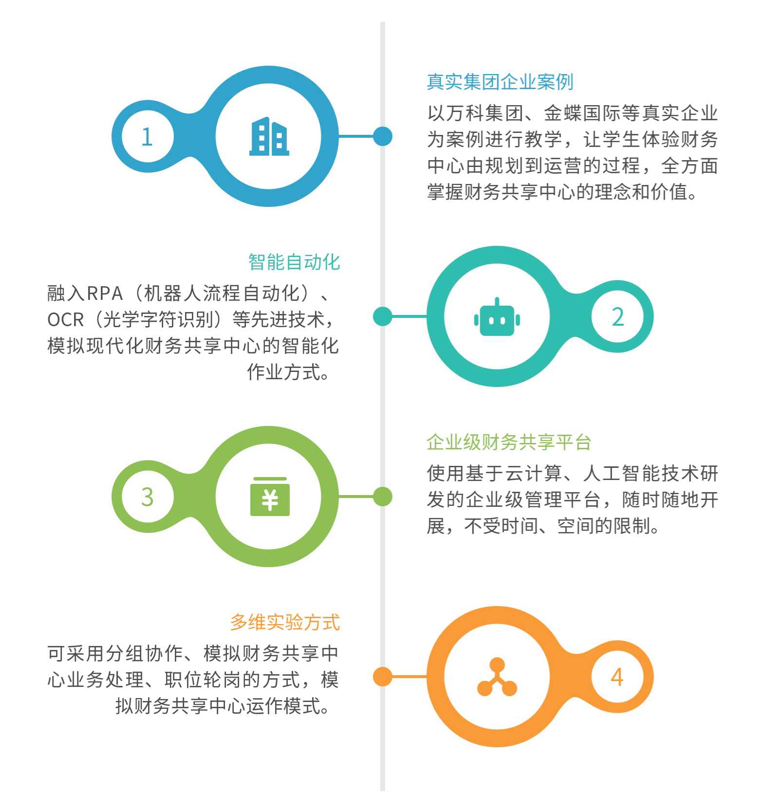 智能财务共享(EAS)基于真实的企业级财务共享平台,充分还原企业从共享中心搭建、共享流程规划到共享业务实践的全流程。涵盖费用共享、应收共享、应付共享、固定资产共享、出纳共享、总账共享、报表共享以及共享运营管理等全模块财务共享实践内容。让学生沉浸式体验集团财务“全面共享”的管理模式、掌握财务共享中心的岗位内容、组织与流程设置、建设理念及价值,具备财务共享中心规划、建设和运营的能力。帮助学生快速适应数字化财务管理的新趋势,同时也为企业培养具备前瞻性和创新能力的财务共享服务专业人才。