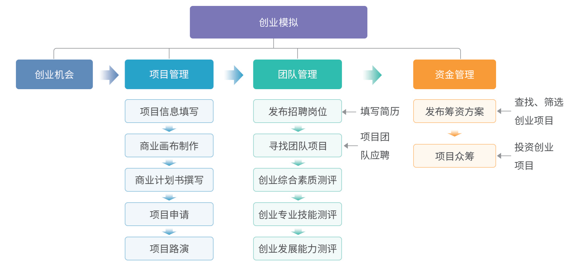 创业模拟实训主要针对创业过程中的基本流程和常用方法而开发,将素质培养、创新精神、创新意识融入学生创业实践,实现素质教育、创业教育与创业实践一体化。本实训按照大学生创新思维培养与创业能力发展的规律,设置了项目管理、团队管理、资金管理三大模块的任务。通过发布项目、撰写商业计划书、项目路演、招募团队成员、资金筹集、资金管理等核心技能任务的训练,力求使学生形成创新思想、树立科学的创业观,掌握创业所需的基本知识和应用实践技能,提高创业的实操水平和管理能力,引导学生运用知识、技能和智慧探索新的商业模式。