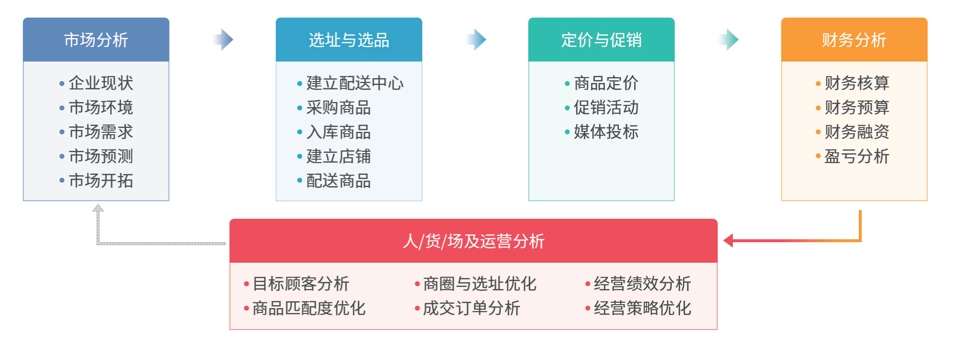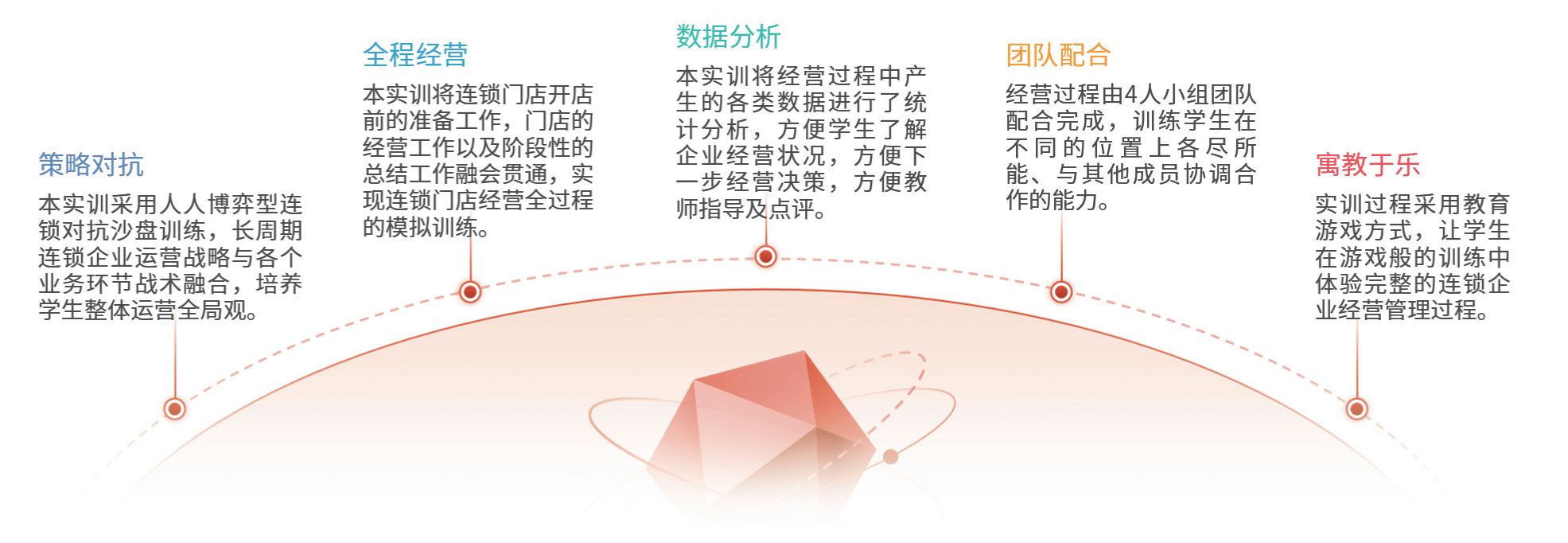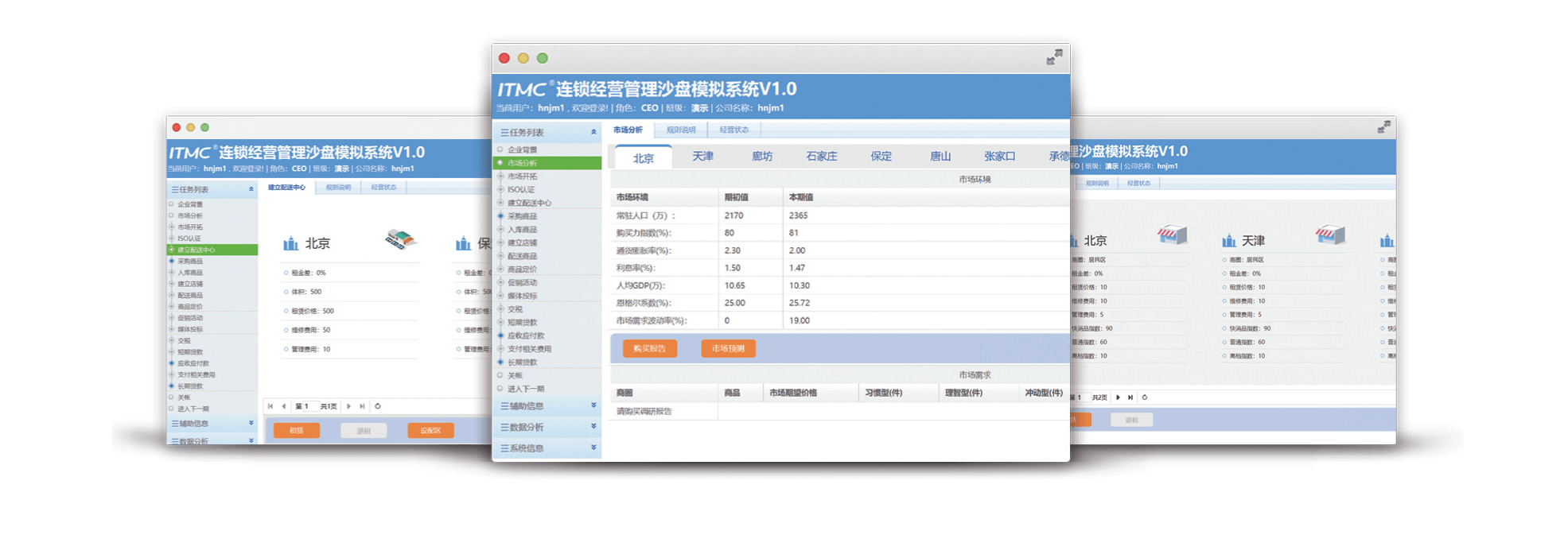 连锁经营管理实训定位连锁企业的运营与管理,将学生分成若干小组,每个小组经营一家连锁企业,每个小组由4人分别担任企业各个部门的岗位负责人(包括总裁、财务总监、运营总监、商品总监),组成企业运营的核心团队,由团队分工合作,完成连锁门店开店前的准备工作(包括市场环境分析、选址、商圈调研、竞争对手分析、发展空间分析等),门店的经营工作(包括商品采购、商品配送、商品定价、促销活动、媒体推广等)以及阶段性的总结工作(包括财务分析、人货场分析、运营分析等),在实训过程中,学生既要进行经营周期长、节点多的连锁企业运营的战略谋划,也要进行各个业务环节的战术制定,让学生在游戏般的体验中完成多个会计年度的连锁企业经营管理全过程,感悟正确的经营思路和管理理念。