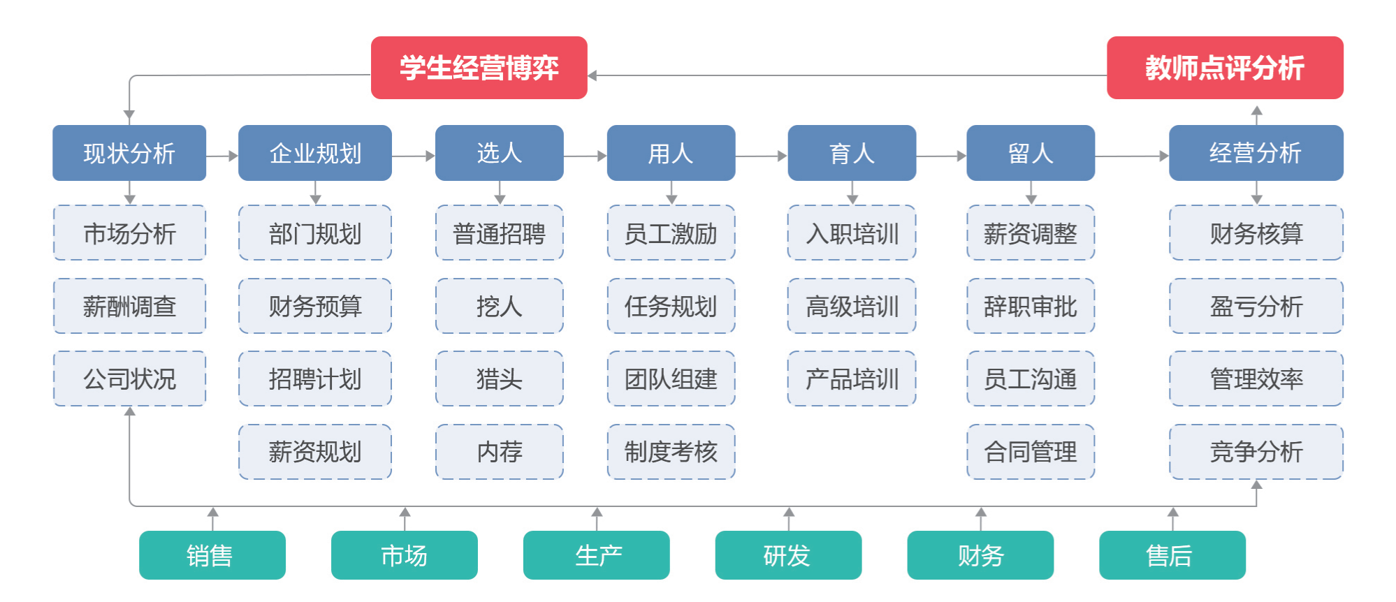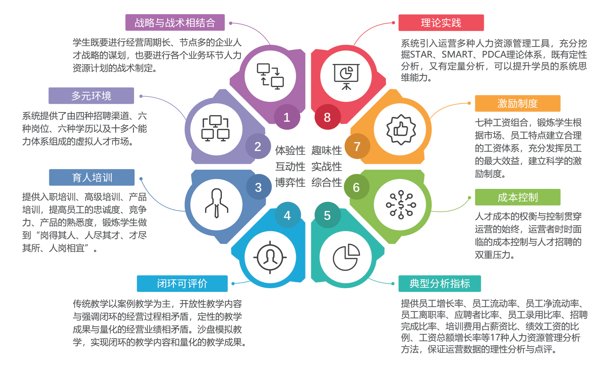 数字人力资源管理实训采用分组零和博弈的游戏化设计思路,基于企业经营过程中人力资源管理的典型工作任务,将学生分成若干小组,每个小组负责一家企业的人力资源部,组成企业的人力资源管理团队,各组在同一个人才市场环境条件下,按照同样的规则条件,连续运营数轮。在这个过程中,学生要学会如何分析人才市场环境;掌握招聘渠道特点;根据企业战略目标,制定招聘计划;并根据人才市场状况、竞争对手策略制定薪资标准、培训计划、绩效考评制度,进行合理的人力资源配置,保证企业价值最大化。实训在动态变化的人才竞争环境中模拟企业在人才战略规划、实施过程中,培养学生的宏观战略思维,让学生总结企业人力资源管理的规律,掌握建设和管理团队的方法和技巧。
