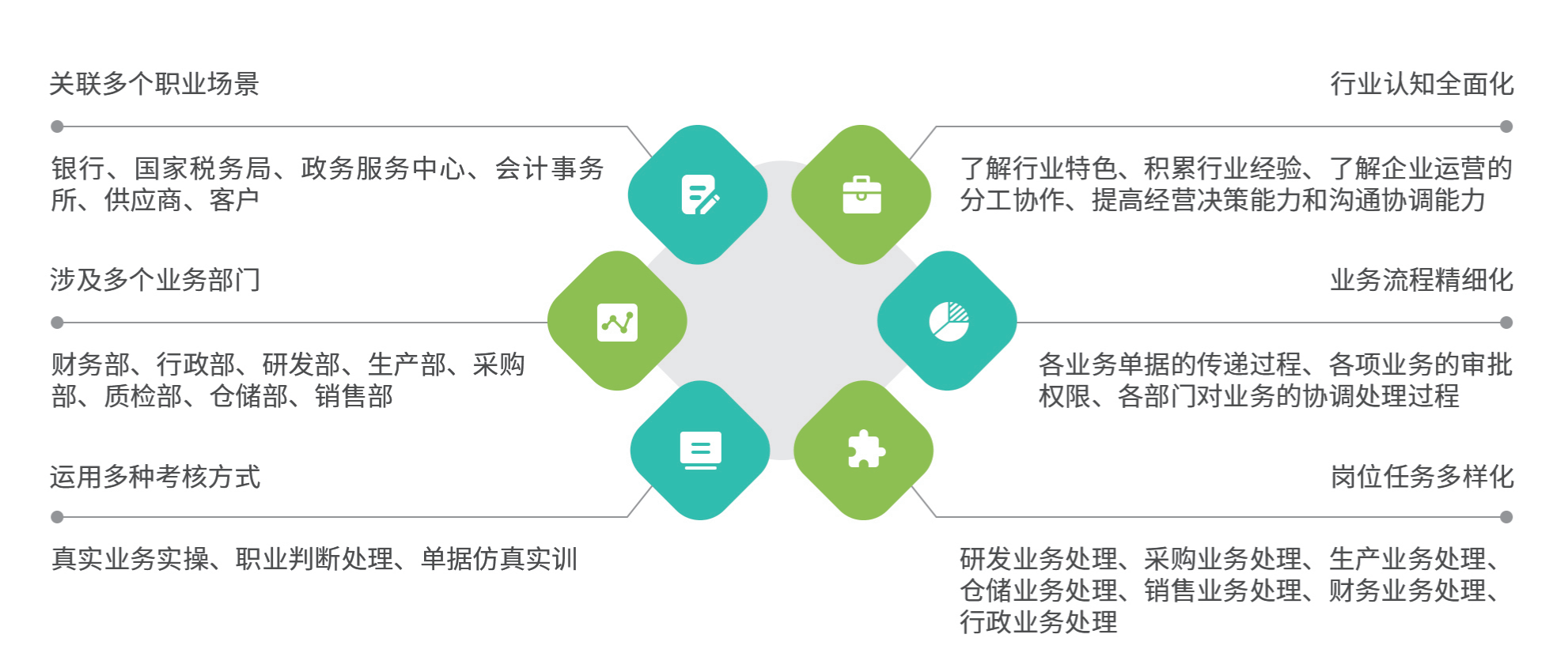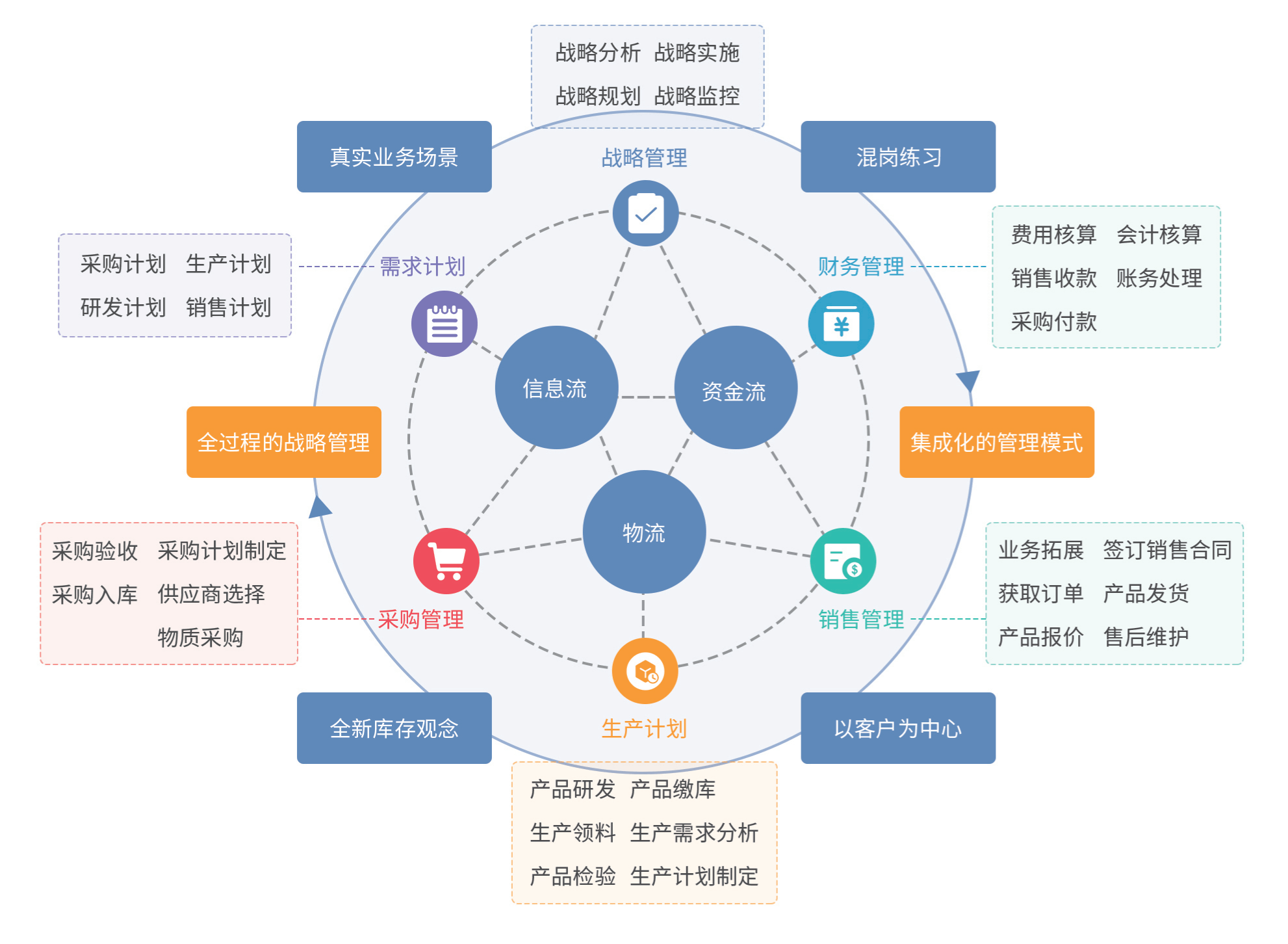 数字化企业经营模拟 基于数字化企业经营活动,将不同行业的业务流程、财务流程、管理流程三大流程搬进系统中,利用虚拟现实技术再现实际的工作场景,以不同行业特色的典型工作任务为驱动,实践企业生产经营过程中的物料供应、产品生产、销售、资金管理等经营业务,展现企业经营过程中数据信息的来龙去脉,破解业务学习的难题,培养学生的职业判断力,为学生进行企业运作和管理打下了坚实的基础。