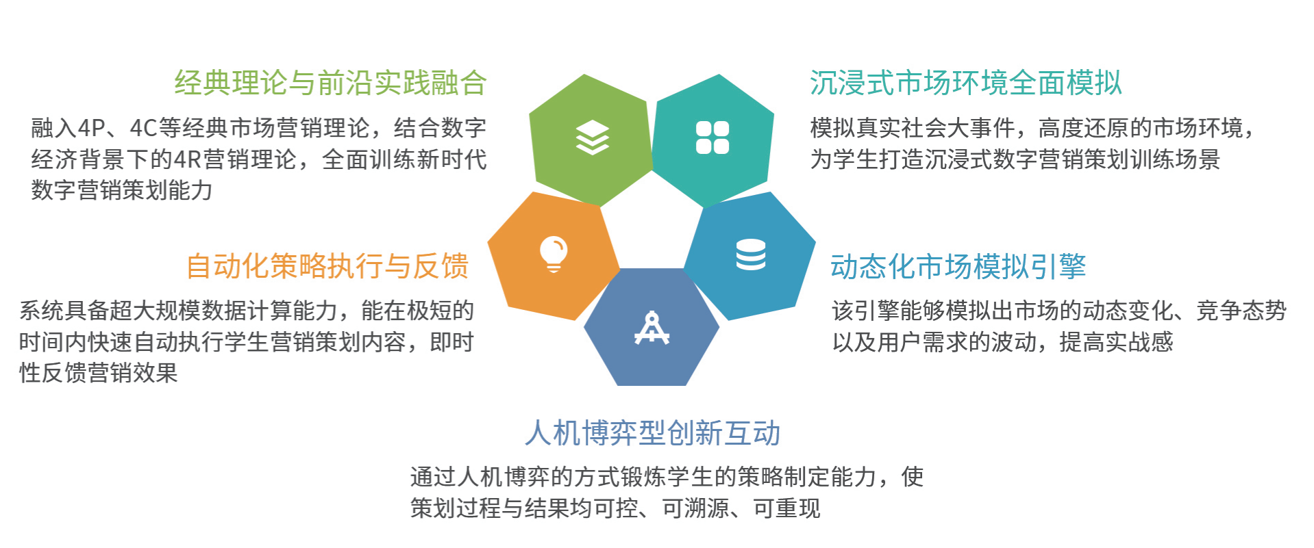 数字营销决策实训对接《数字营销策划》《数字营销决策》等课程,立足企业数字营销策划人才的技能要求,融入4P、4C等经典市场营销理论及数字经济背景下的4R营销理论,还原真实社会大事件以及市场动态数据,建立一个以数字营销决策为核心的综合实训沙盘平台。学生在一个动态化变化的市场环境中,通过人机博弈的方式完成市场分析、目标人群画像分析、数字广告营销策划、产品销售策划、促销活动策划、客户关系管理等方面数字营销策略的制定,系统根据学生的策略情况自动执行营销活动并反馈营销效果数据,通过营销效果数据衡量学生的数字营销策划能力。同时,学生可以根据营销效果数据发现问题、分析问题,并通过营销策略的调整解决问题,最终为企业带来最大的品牌效应与销售收益。