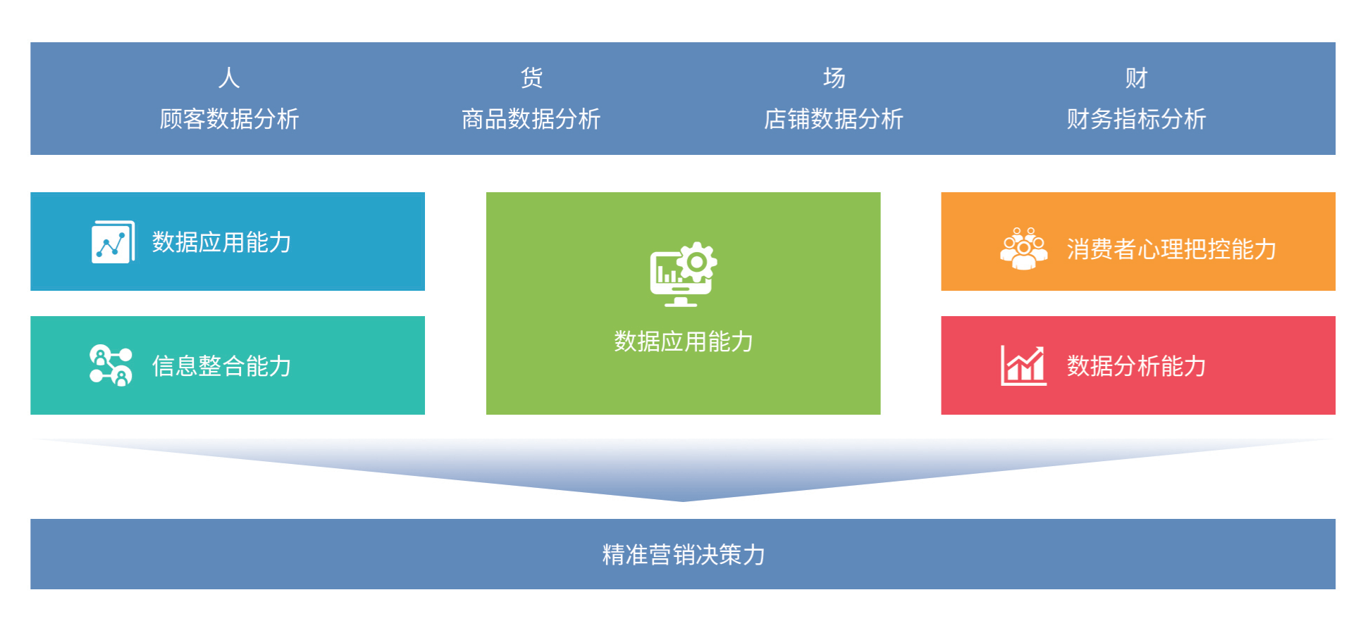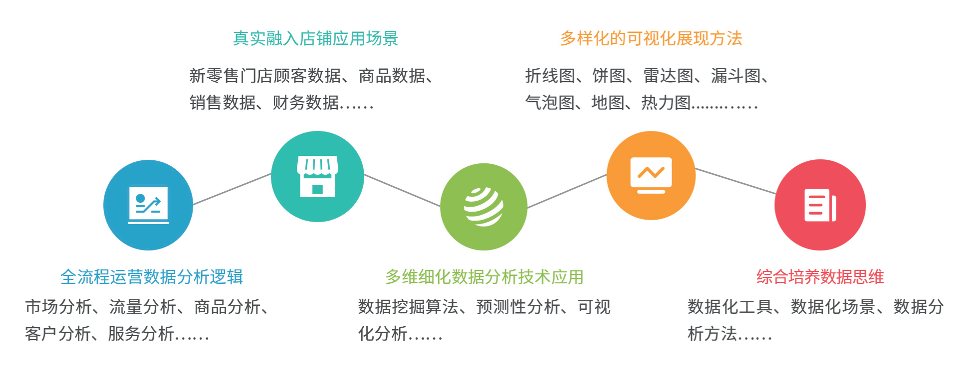 新零售商务数据分析实训依托于众多连锁业态的真实经营数据,以云计算、数据采集以及智能化分析技术为支点,抓住新零售行业利用数据技术进行分析和预测的需求,纳入多维细化大数据分析技术和可视化展现方法,对顾客数据、商品数据、店铺数据、财务数据等进行处理与分析,为经营者进行问题分析和研究、制定相应的营销策略提供数据支撑。通过实训,学生能够具备信息整合能力、数据收集能力、数据分析能力、消费者心理把控能力及数据应用能力,提高精准营销决策力。