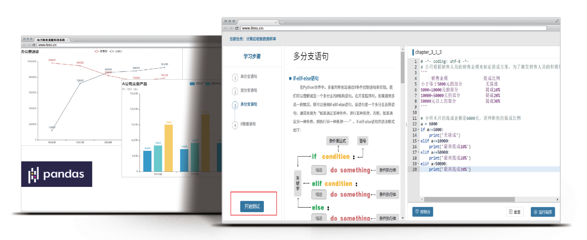 Python财务应用基于Python简洁、易读的语言特性,将计算机思维和财务思维进行融合,用OJ测评评价算法,提高可操作性和可评价性。对接Python基础语法、数据结构、流程控制语句、函数等理论知识,以Python技术在财务中应用的典型场景设计工作任务,以财务应用场景为主线,以企业财报数据、业务数据为素材,采用任务驱动的方式,由浅入深地设计Pyrhon财务应用基础、Python财务数据分析及Python财务数据分析综合应用项目实训任务。通过Python在财务数据处理、财务报表数据可视化、往来账款分析、经营业务分析、财务成果分析等场景的应用学习,探索Python在财务领域的应用设计,并利用数据分析结果为企业提供决策支持,培养Python财务数据分析能力。
