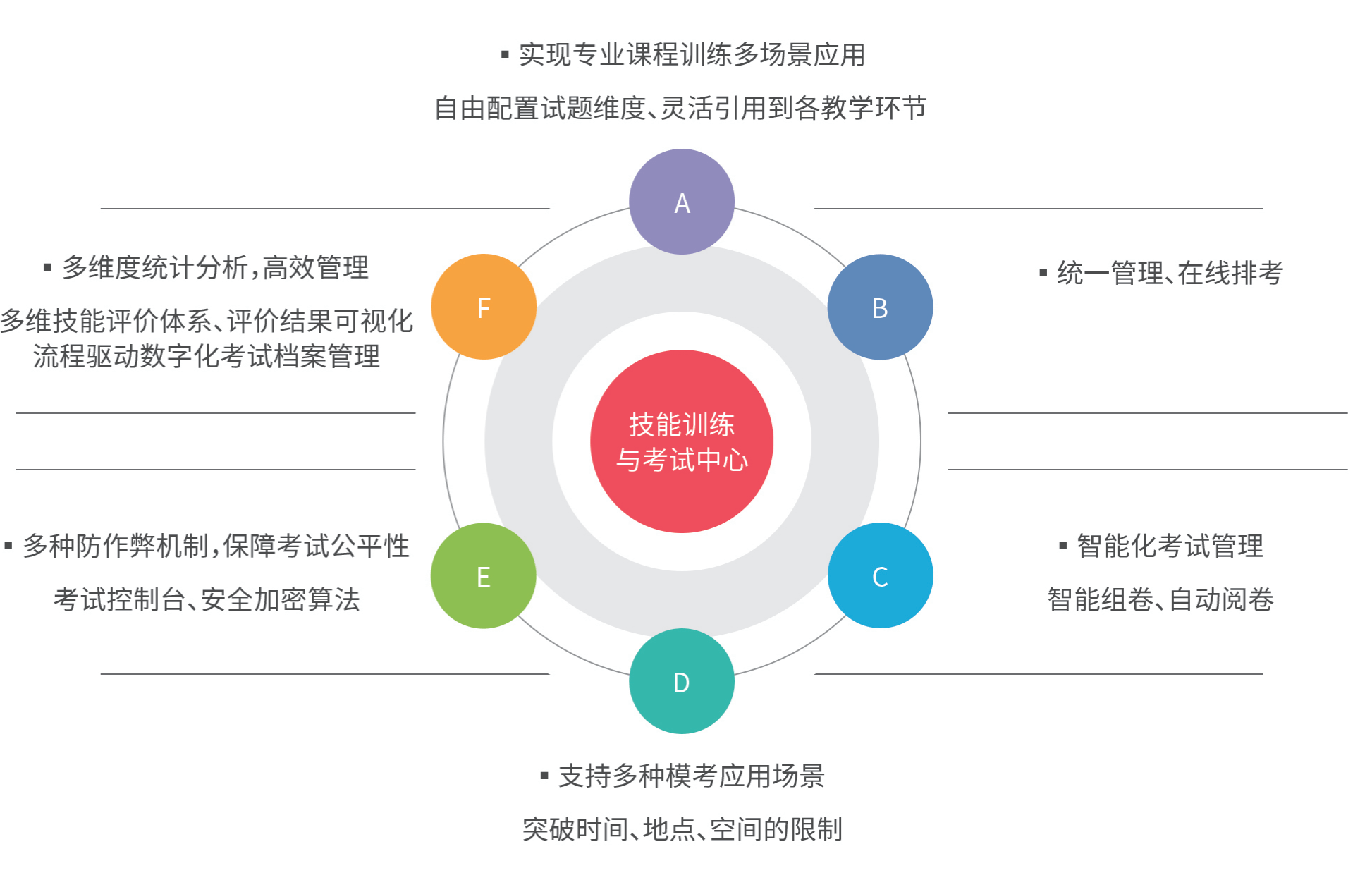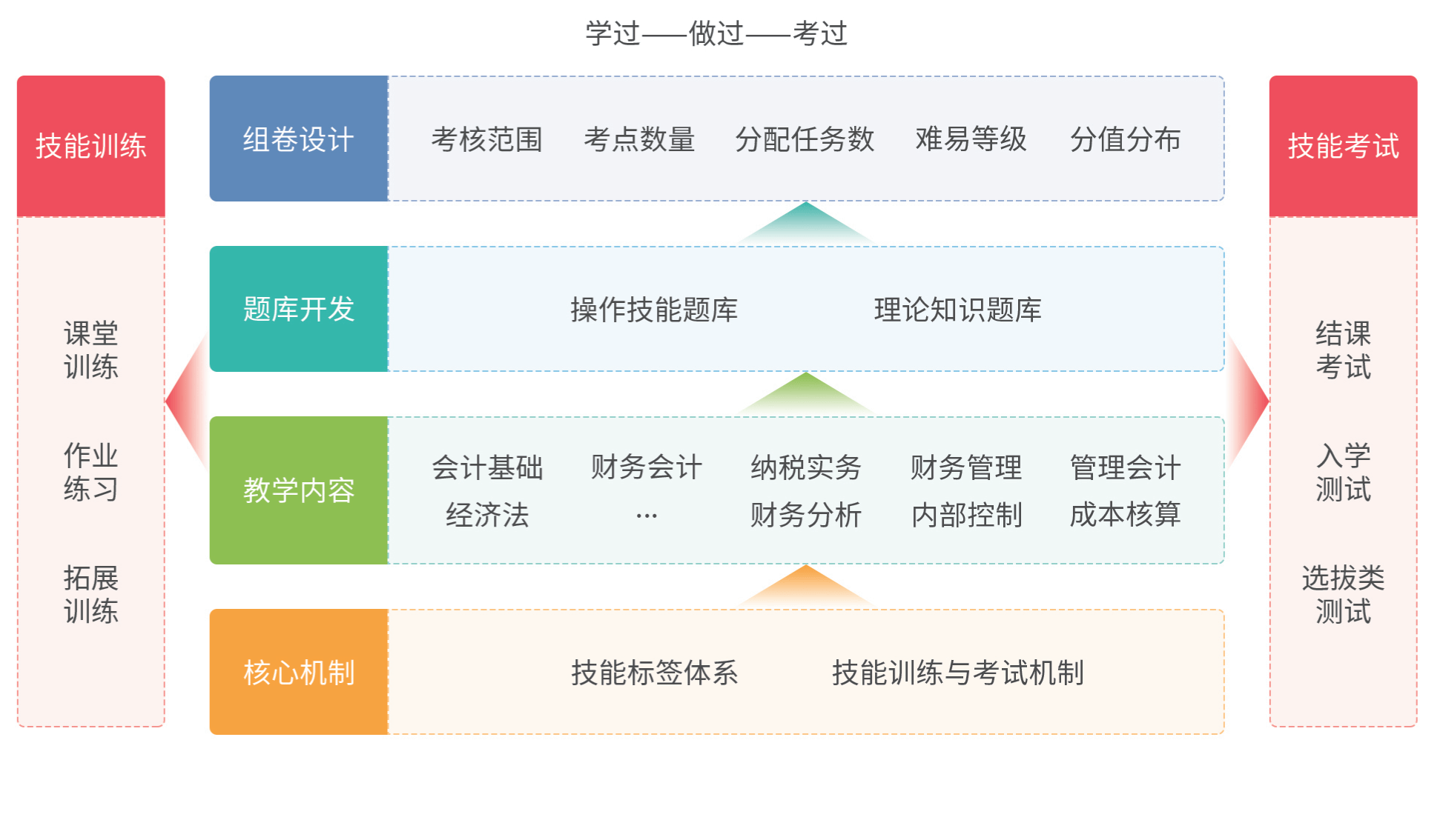 会计技能训练与考试打破传统的学科教学训练体系,以就业为导向、以社会需求为导向,合理配置专业课程技能核心训练内容,对接训练与考试各应用场景。以学过、做过、考过为原则,精心设计专业核心课程的理实一体化训练和考试项目。以技能训练内容有用化、技能评价多维化和技能效果可视化,对学校各级参与考试的部门、学生、班级、课程等进行可视化管理,提供专业化训练与考试题库用于课堂训练、组卷模考,对试题技能点、考核目标进行统一规划。