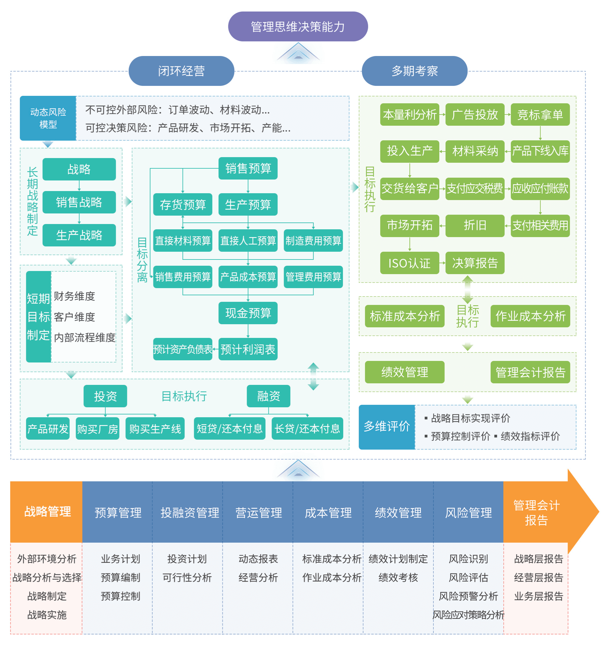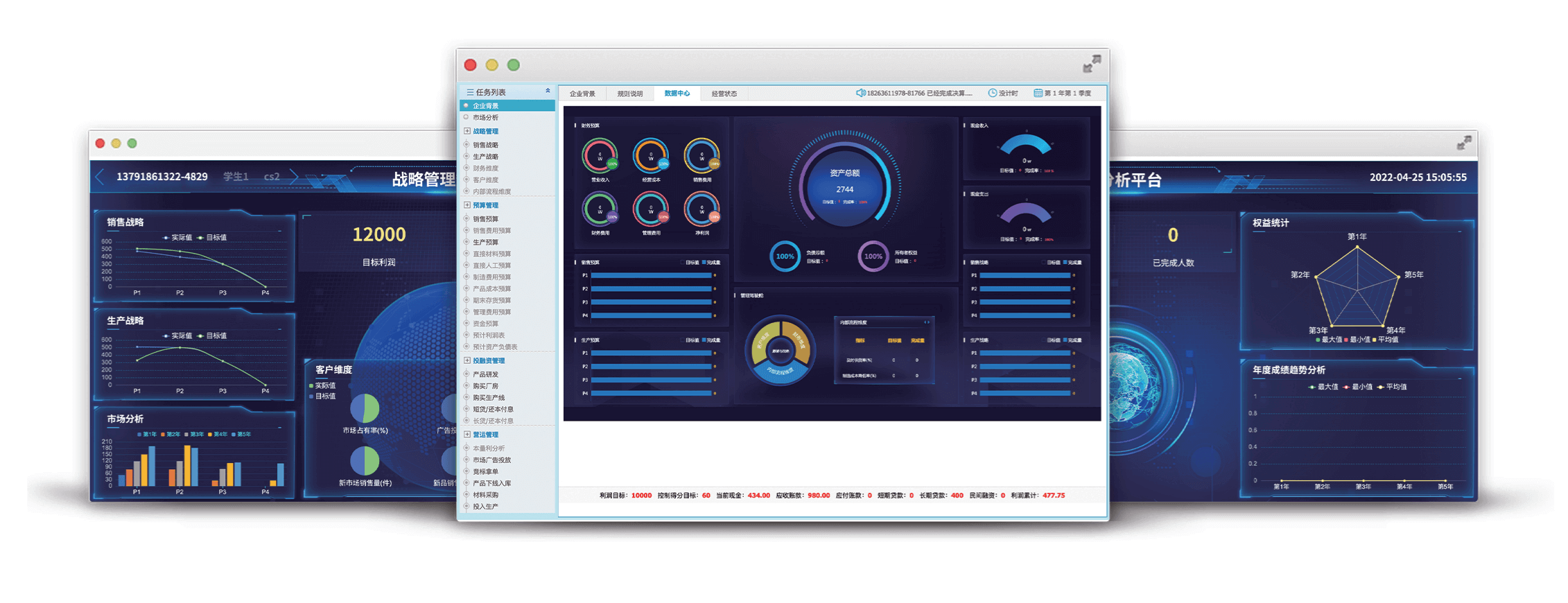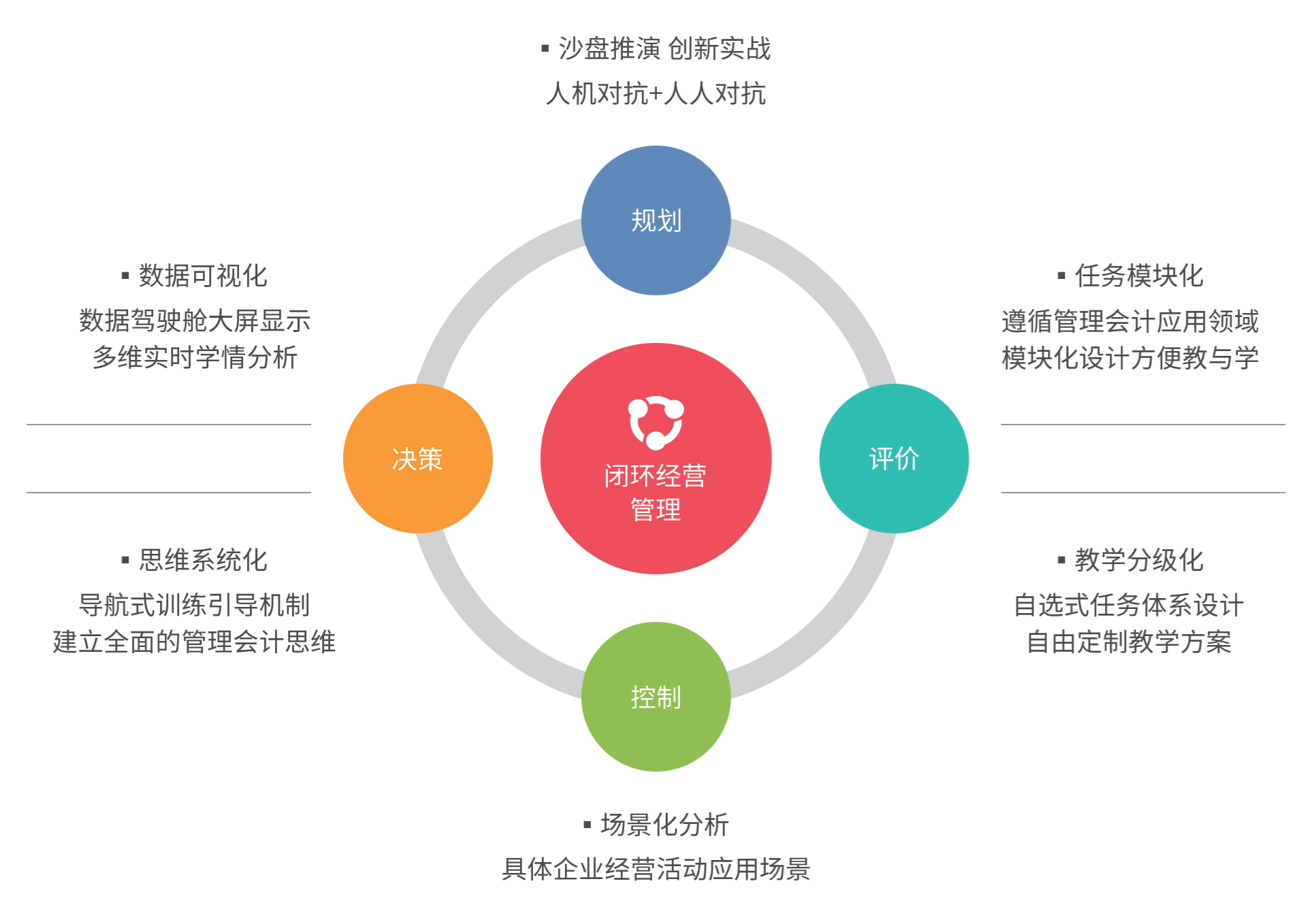 数字化管理会计沙盘采用“零和博弈”的游戏化设计思路,由学生运营在同一行业,初始情况完全相同的不同企业,模拟不同经济活动下管理会计活动的各个环节,连续经营数个会计年度,涉及战略规划、滚动预算管理、标准成本分析、本量利分析、平衡计分卡等多种管理工具方法。学生在相互竞争中利用财务信息和非财务信息,根据市场和经营情况制定或调整战略规划与经营策略,通过规划、决策、控制、评价等闭环工作任务和反复经营来验证企业战略和决策的正确性,最终根据其决策的正确与否形成满足管理的分析报告,充分考察学生综合运用管理会计专业知识和工具进行分析、判断和处理实际问题的能力,培养指导企业经营的管理会计思维。