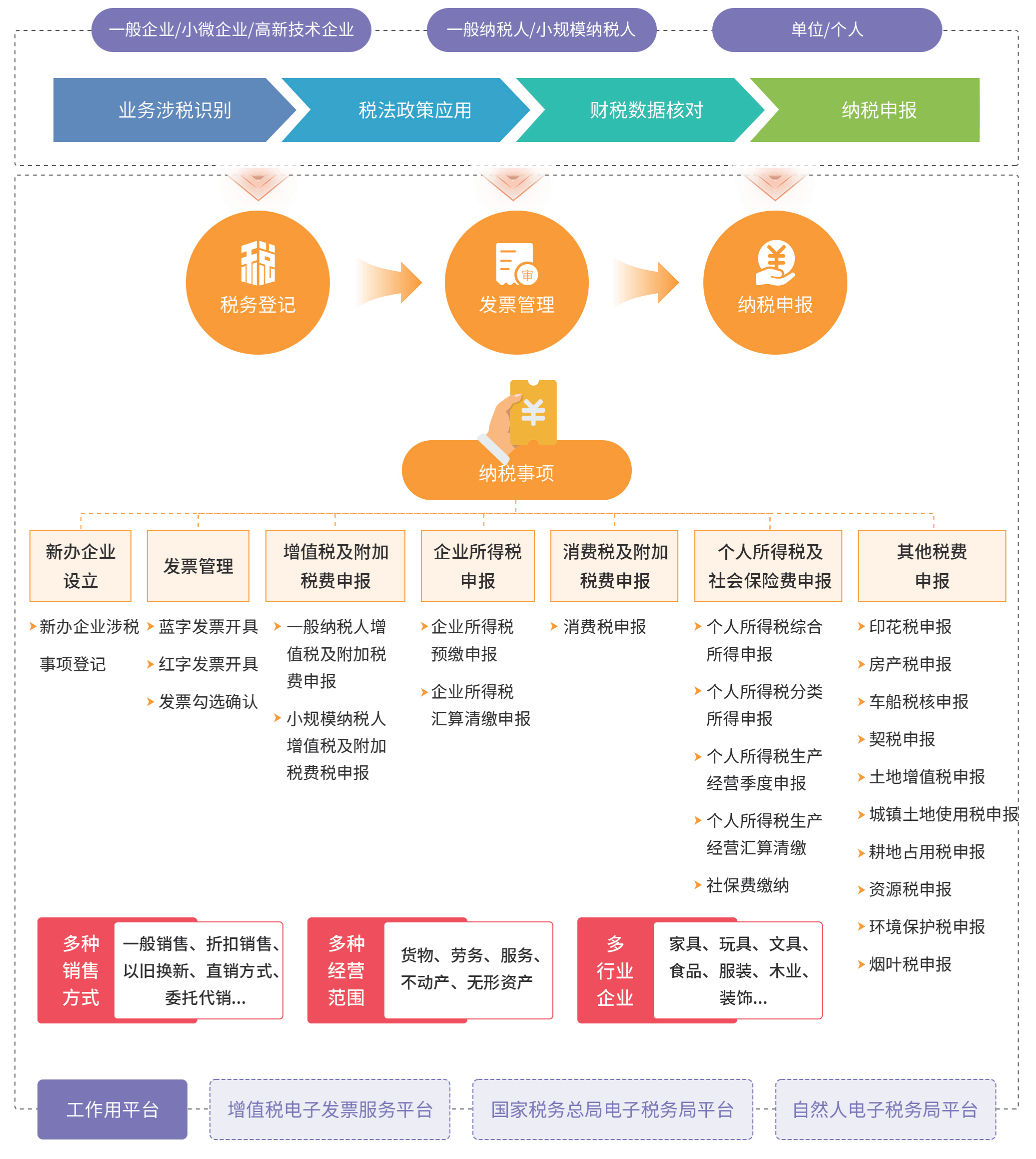 智能税务主要内容结合税务会计岗位实际,涵盖发票管理、各税种(增值税、企业所得税、个人所得税、社保费、消费税及小税种)计算、申报全流程,旨在引导学生分析企业类型、涉税业务,从企业业务视角深刻理解税法内涵,熟练掌握开票与纳税申报操作,培养学生依据法律法规进行涉税判断、纳税申报处理,全方位锻炼其在真实业务情境下的核心税务事务处理技能。