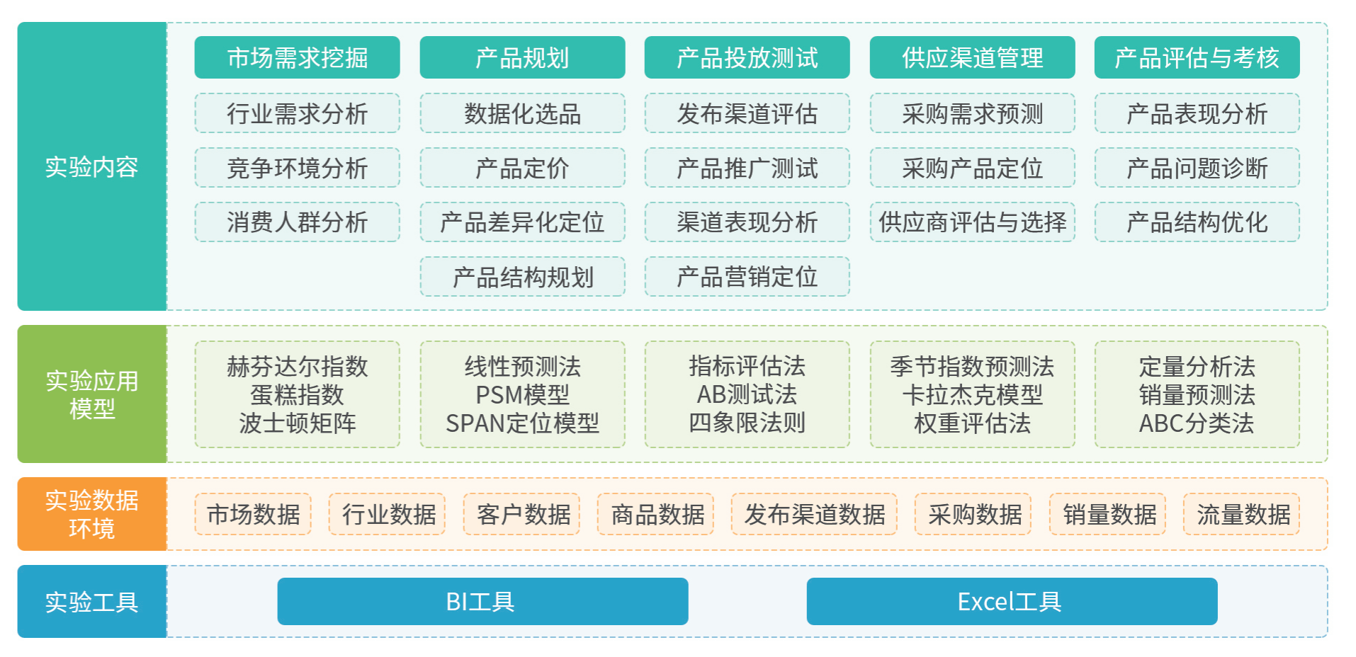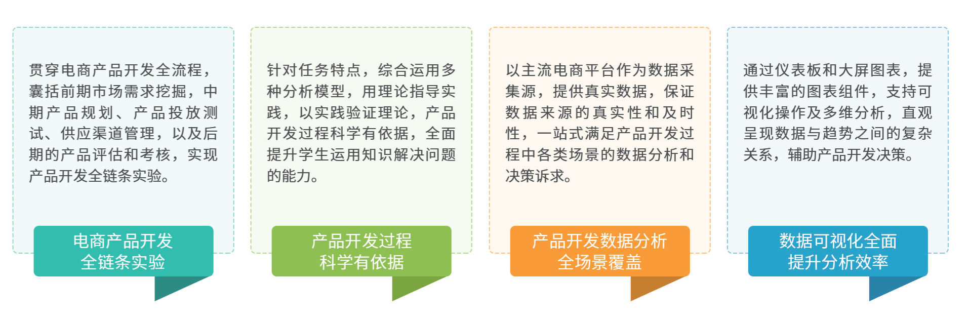 电商产品开发实验顺应数字化时代下电子商务行业的变革趋势,依据高校对理论与实践相结合的复合型人才培养需求,深度融合电商产品开发相关的岗位需求与岗位职责,引入先进的数据分析工具与分析方法,并以主流电商平台数据为基础,提供真实、及时的数据支持及丰富的图表组件,模拟了真实的电商产品开发环境,覆盖市场需求挖掘、产品规划、产品投放测试、供应渠道管理、产品评估与考核等电商产品开发全流程,实现了理论与实践的深度融合,有效解决了传统商科教育中理论与实践脱节的问题,全面培养学生的市场洞察力和电商产品开发能力。