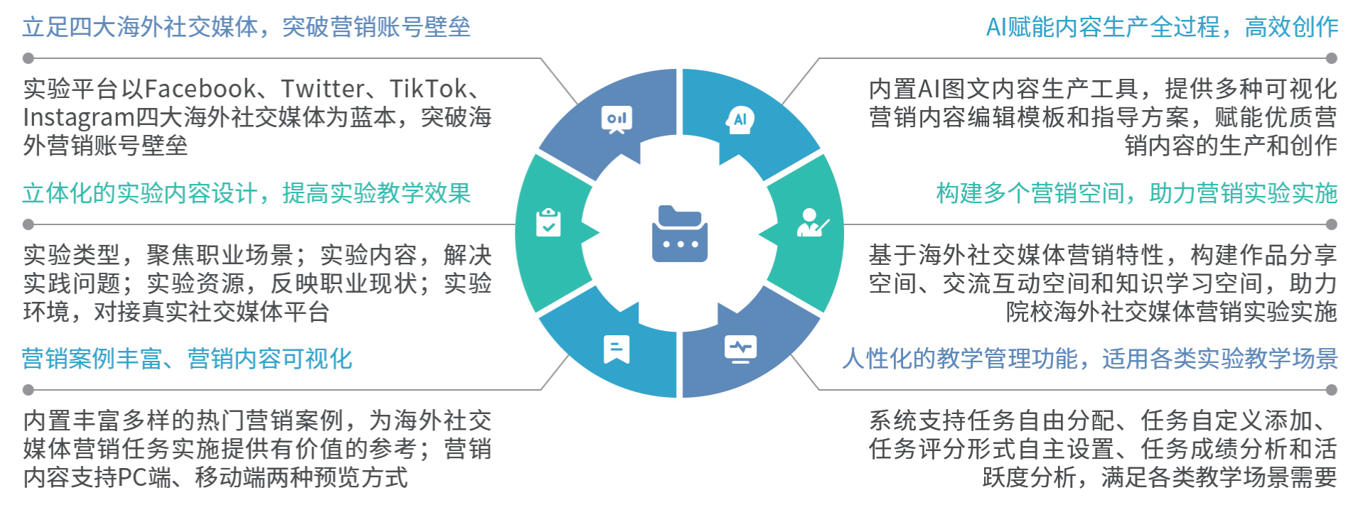海外社交媒体营销实验立足Facebook、Twitter、Instagram、TikTok等跨境电商海外营销主流的社交媒体平台,模拟平台的主要功能和页面设计,创设逼真的内容生产、发布、传播环境,营造沉浸式海外社交媒体营销实验环境。通过多次、反复执行不同海外社交媒体平台、不同商品、不同营销目的的实验内容,掌握主流海外社交媒体平台的营销逻辑,营销活动策划以及图文、短视频、H5等多种形式营销内容的设计方法和技巧,满足国际市场营销相关课程实践教学的需要。培养懂方法、会分析、能策划、善营销的海外社交媒体营销复合型、应用型、创新型专业人才,助力中国品牌出海。