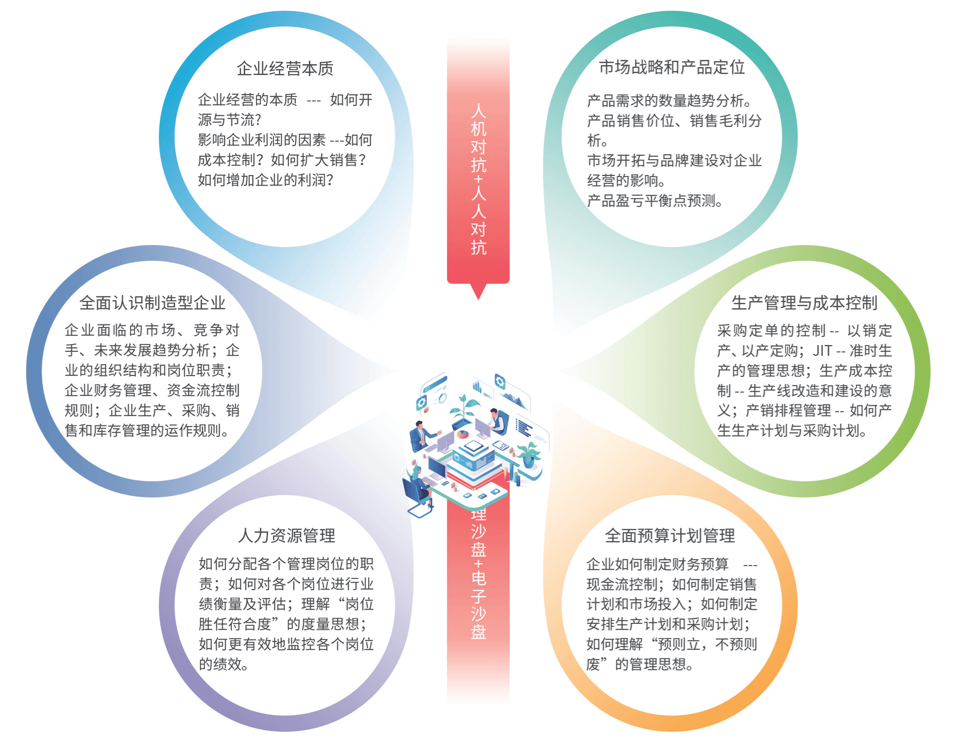 企业经营管理沙盘模拟实验以制造企业为背景,将学员分成若干个团队,各代表着CEO、财务总监、市场经理、生产经理和采购经理等管理角色。每个团队经营一个销售良好、资金充裕的虚拟公司,连续从事数个会计年度的经营活动,内容涉及企业整体战略、产品研发、生产、市场、销售、财务管理、团队协作、绩效考核等多个方面。在实验过程中,学生要学会如何进行市场调研与分析、销售模式的分析、消费者行为分析、产品定位与功能定位、竞争对手分析,以此选择目标市场,从而形成经营战略,然后根据战略目标进行市场营销策略组合。在这个过程中,学生将遇到企业经营中常出现的各种典型问题,学生要并不断发现问题与机遇、分析原因、制定决策并调整企业经营战略,以保证企业的正常运作及利润最大化。