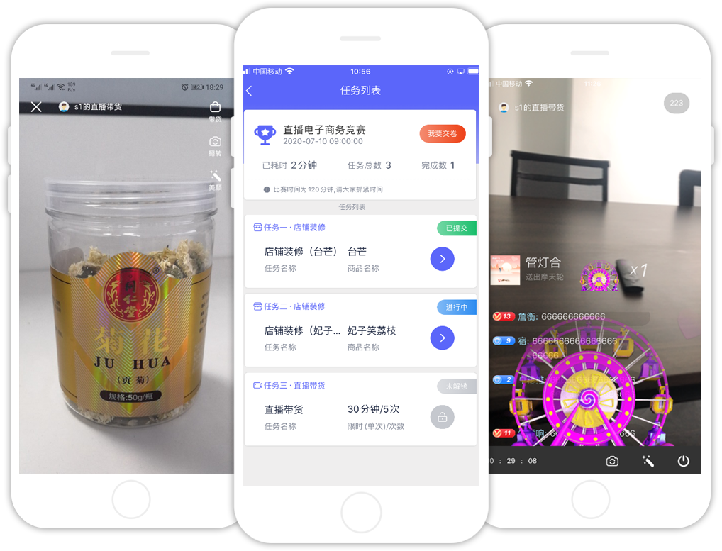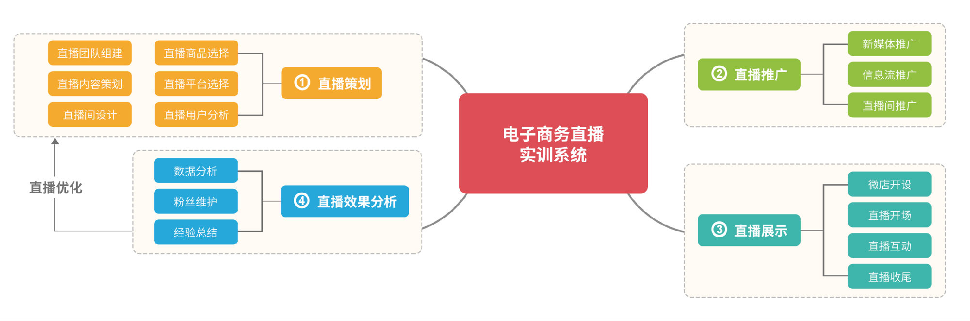 “电子商务直播实训系统”模拟真实直播平台,采用人工智能逆向应用技术,实现直播活动的闭环测评与实时互动。系统以直播活动的策划、展示与推广为核心,内置直播策划、直播推广、直播活动实施、直播效果分析与优化等模块,训练学生的微店开设、直播策划、直播推广、直播展示、直播互动及直播运营等能力。