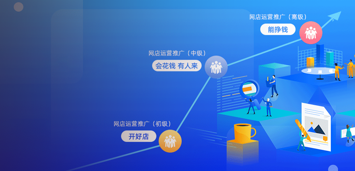 针对电商岗位能力需求,全方位培养电子商务核心技能,下设网商、跨境两个方向,初中高三个级别。初级定位“开好店”,具备网店开设与装修、客户服务能力,中级定位“会花钱有人来”,具备网店推广能力,高级定位“能挣钱”,具备网店规划运营能力。