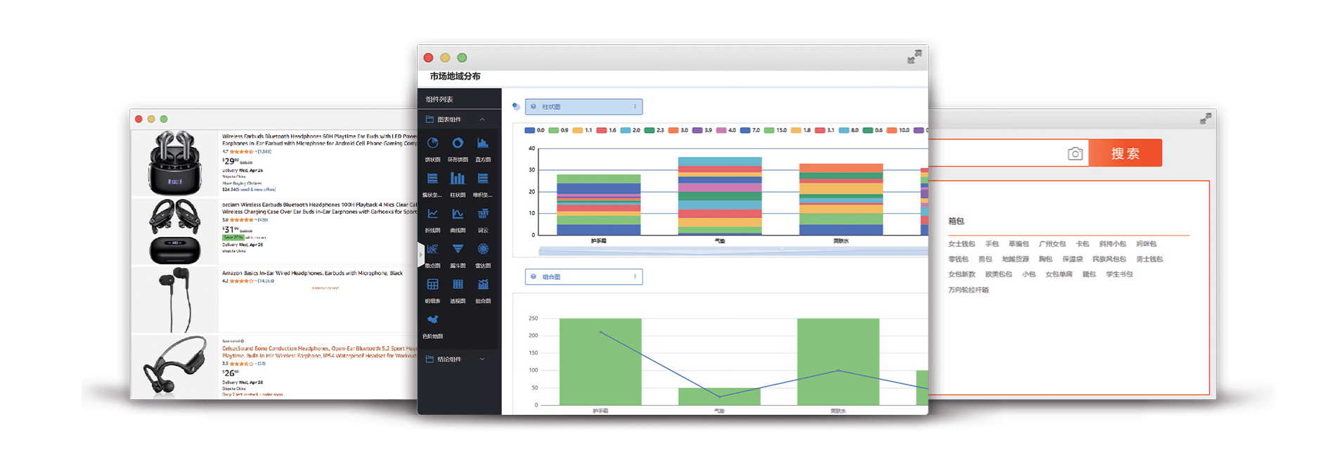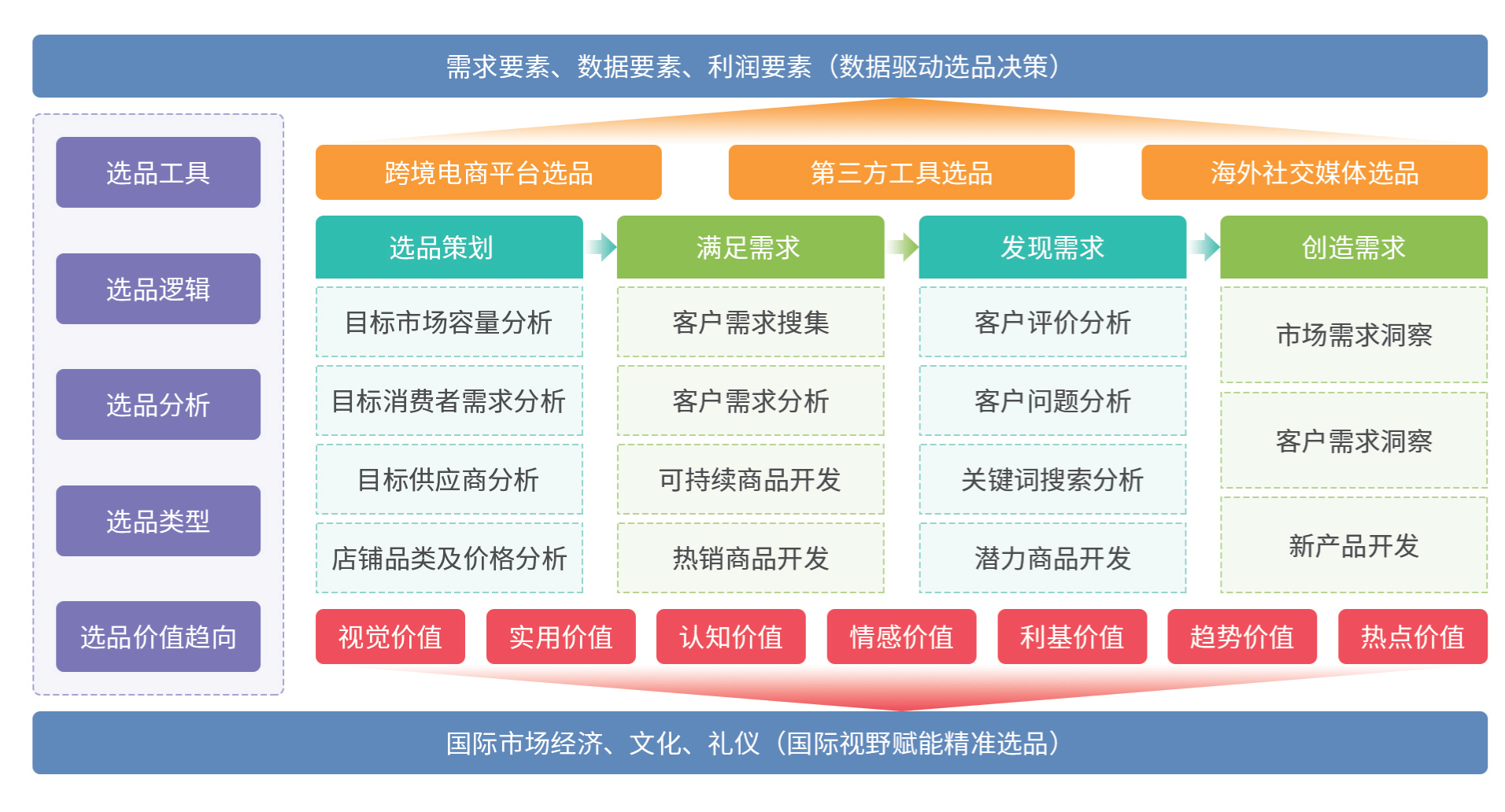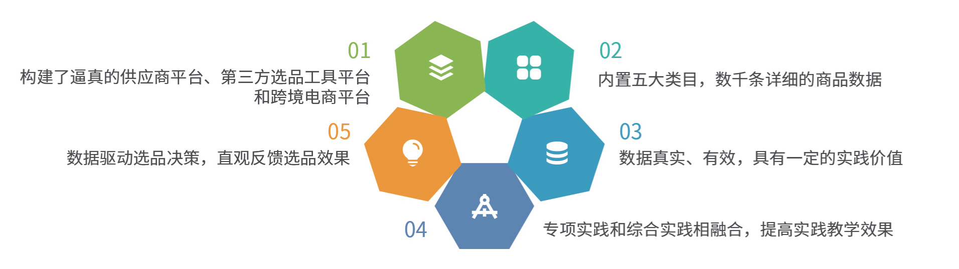 跨境电商选品实训主要面向跨境电商选品岗位(群),以数据驱动选品决策为出发点,进行目标市场需求分析、产品分析、目标供应商分析;借助平台内置的跨境电商平台、第三方选品工具、海外社交媒体平台等选品工具,寻找优质产品,优化供应链,提升产品竞争力。本实训平台是以“专项能力实践+综合应用实践”为主要模式的数据化选品实践平台,通过专项能力实践,培养学生的选品分析能力和不同类型产品开发能力;通过综合应用实践,培养学生的选品决策应用能力、店铺品类开发能力以及商品组合开发能力,提高选品决策的科学性、有效性和精准性。
