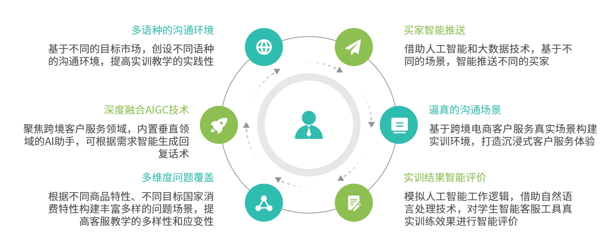 跨境电商智能客服实训主要面向跨境电商客户服务岗位(群),以阿里国际站、亚马逊、速卖通、Wish等四大主流跨境电商平台客户服务体系为载体,引入最新的AIGC技术,全真模拟跨境电商平台客户服务工作场景,采用任务驱动、问题引导的方式进行实训内容设计,全面培养学生的智能工具应用能力、客户需求识别与创造能力、客户问题解决能力、客户场景营销能力、客户关系维护能力。助力既懂智能客服新技术,又懂客户需求和跨境电商业务,兼具多语种跨文化沟通和服务意识的高素质应用型人才培养。