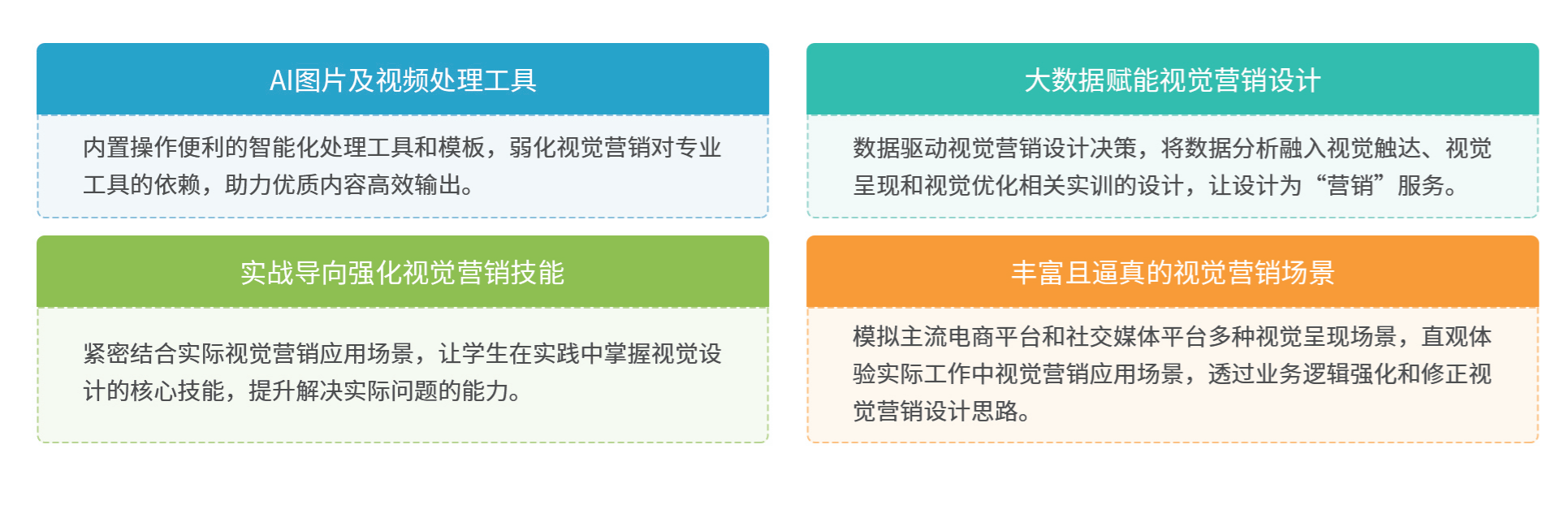 视觉营销设计面向视觉设计岗位(群),基于电子商务、移动商务等专业核心课程的实践教学标准,深度融合行业企业视觉营销能力需求及电子商务赛项中视觉营销相关的竞赛内容和规范,按照“视觉分析——视觉呈现——视觉触达——视觉反馈——视觉优化”的逻辑进行实训任务设计和实训场景构建,全面满足视觉营销相关课程的实践教学需求,电子商务赛项中相关技能的训练与模拟竞技需求,集“教、学、赛、训、评”于一体,全面培养学生的视觉营销能力。