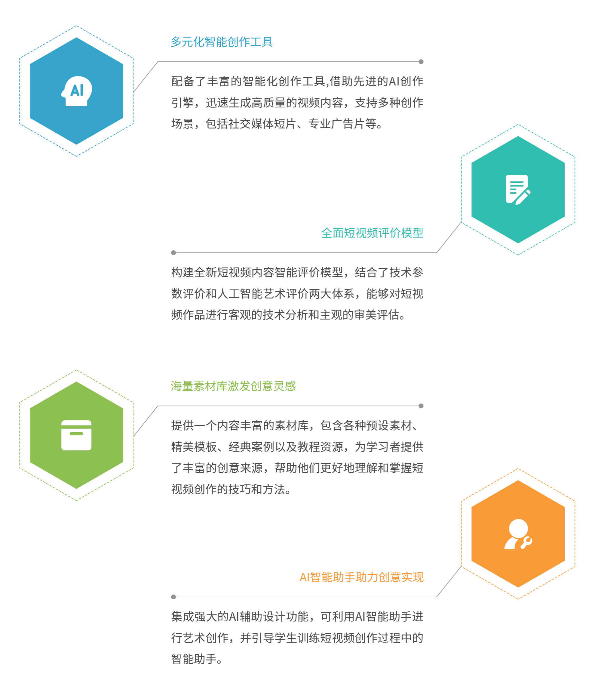 短视频创作针对短视频创作全流程,覆盖短视频定位、策划、拍摄、后期编辑四大关键领域,采用“五步教学法”,深度融合理论与实践,内嵌海量实训任务和教学资源。短视频创作借助虚拟仿真技术与AI智能模块创新设计,囊括了从创意策划、拍摄技法至后期特效的全流程仿真训练,并独创客观与智能主观相结合的评价机制,深度指导并评估学习者的作品质量。该软件以培养适应短视频智能生产的新型人才为目标,充分利用AIGC技术赋能创作流程,助力学习者快速掌握短视频艺术和技术精髓,构建一个理论扎实、技术娴熟、创新能力强的新时代短视频创作人才培育环境。