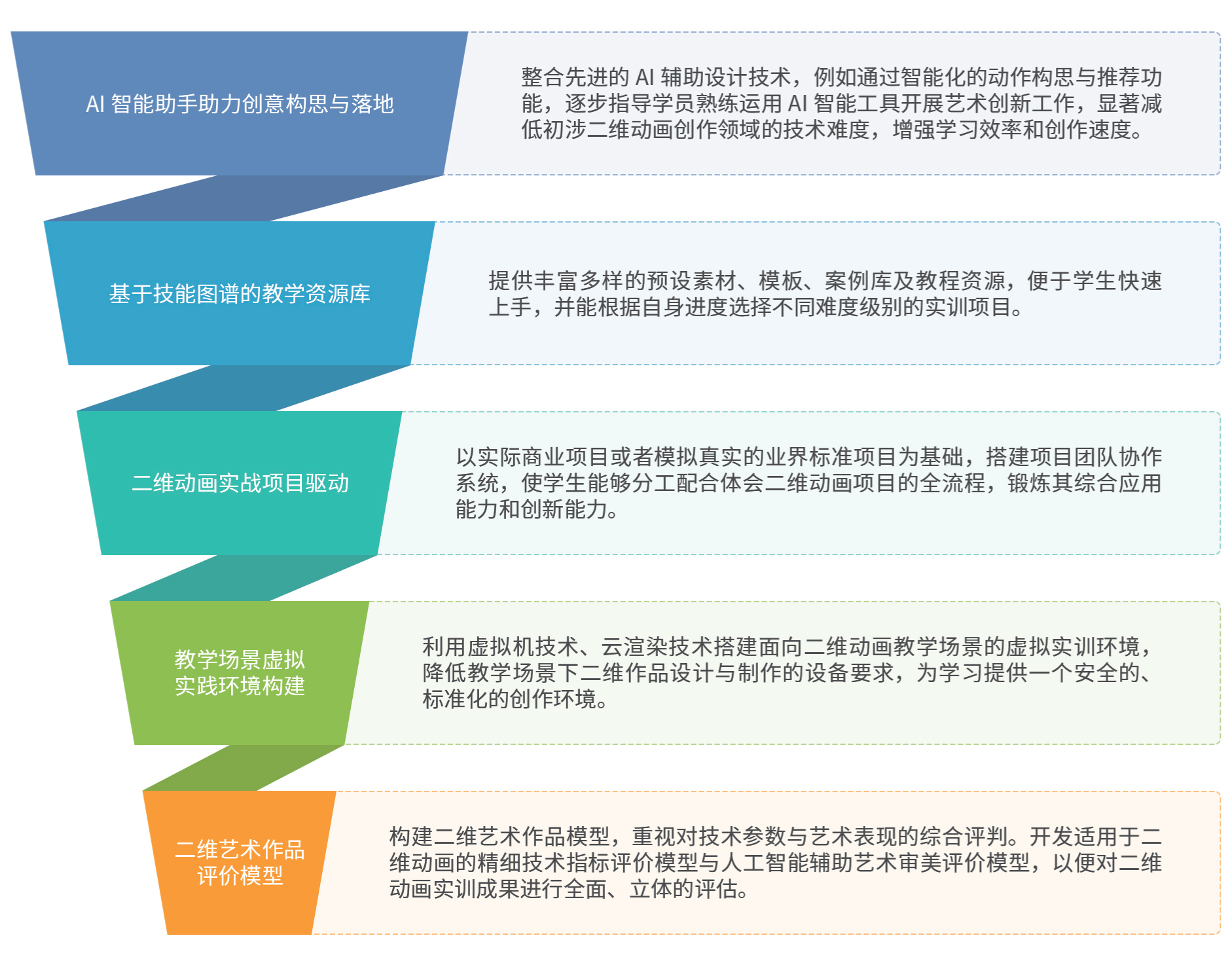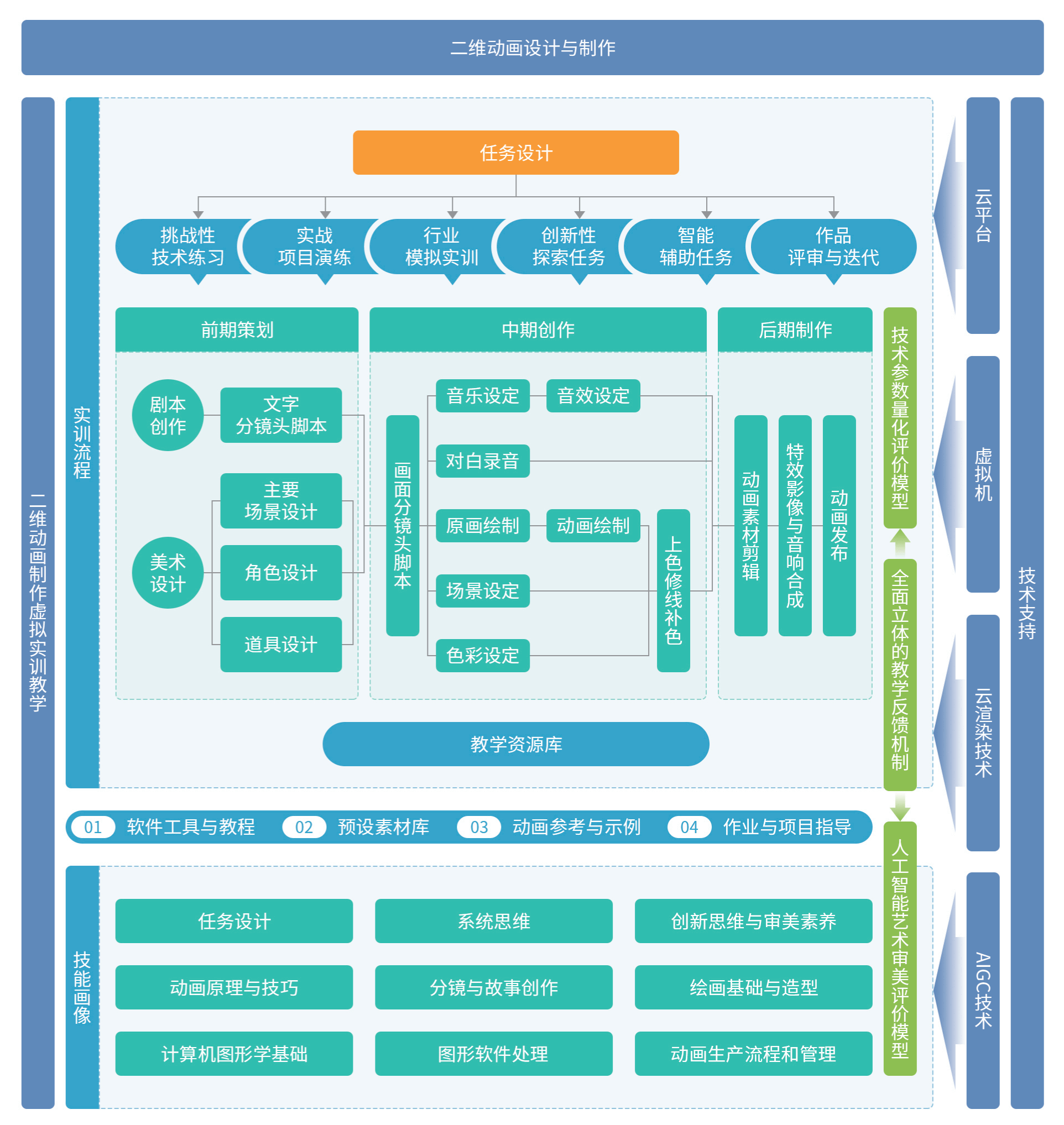 二维动画设计与制作实训构建了一站式的动画制作技能训练架构,涵盖动画剧本创作、动画分镜设计、原画设计、动画设计与制作、特效设计与制作、动画后期制作与合成的全流程实训环节。二维动画设计与制作实训采用前沿技术,AI智能辅助设计功能降低技术门槛,增强学习体验,并整合虚拟机与云渲染技术打造无硬件限制的标准化创作环境,创新性地构建了二维艺术作品双维度评价模型,结合技术参数与AI艺术评价,突破动画作品评价难题,为学习者提供了一个高效、便捷且全面的二维动画创作实践方案。