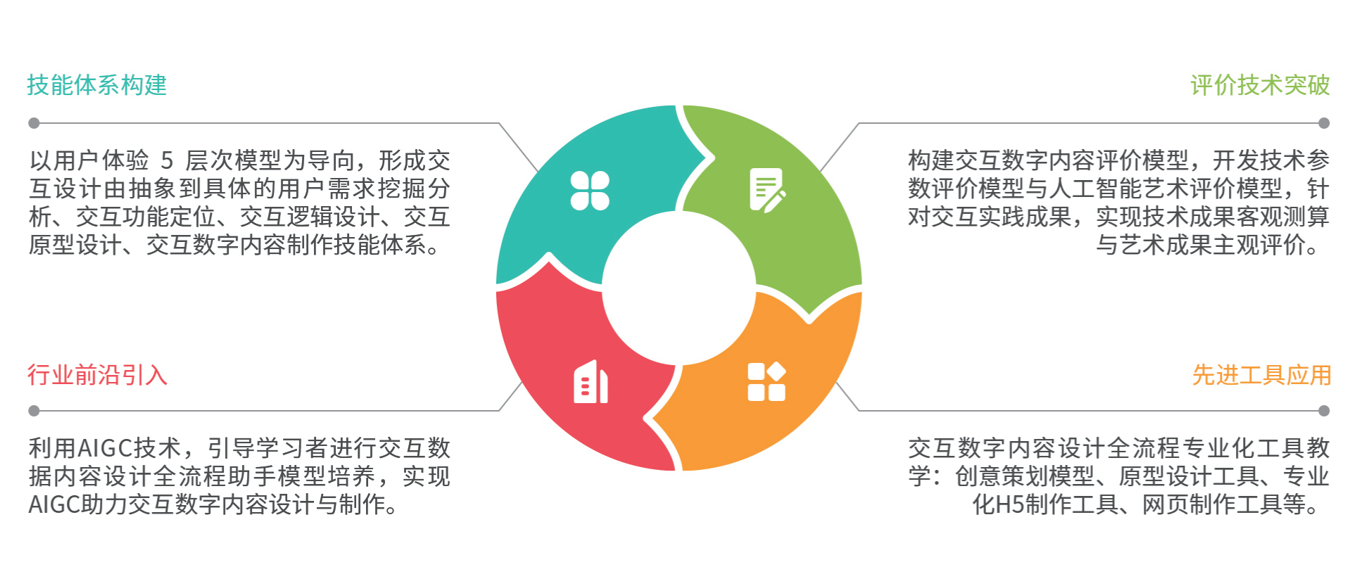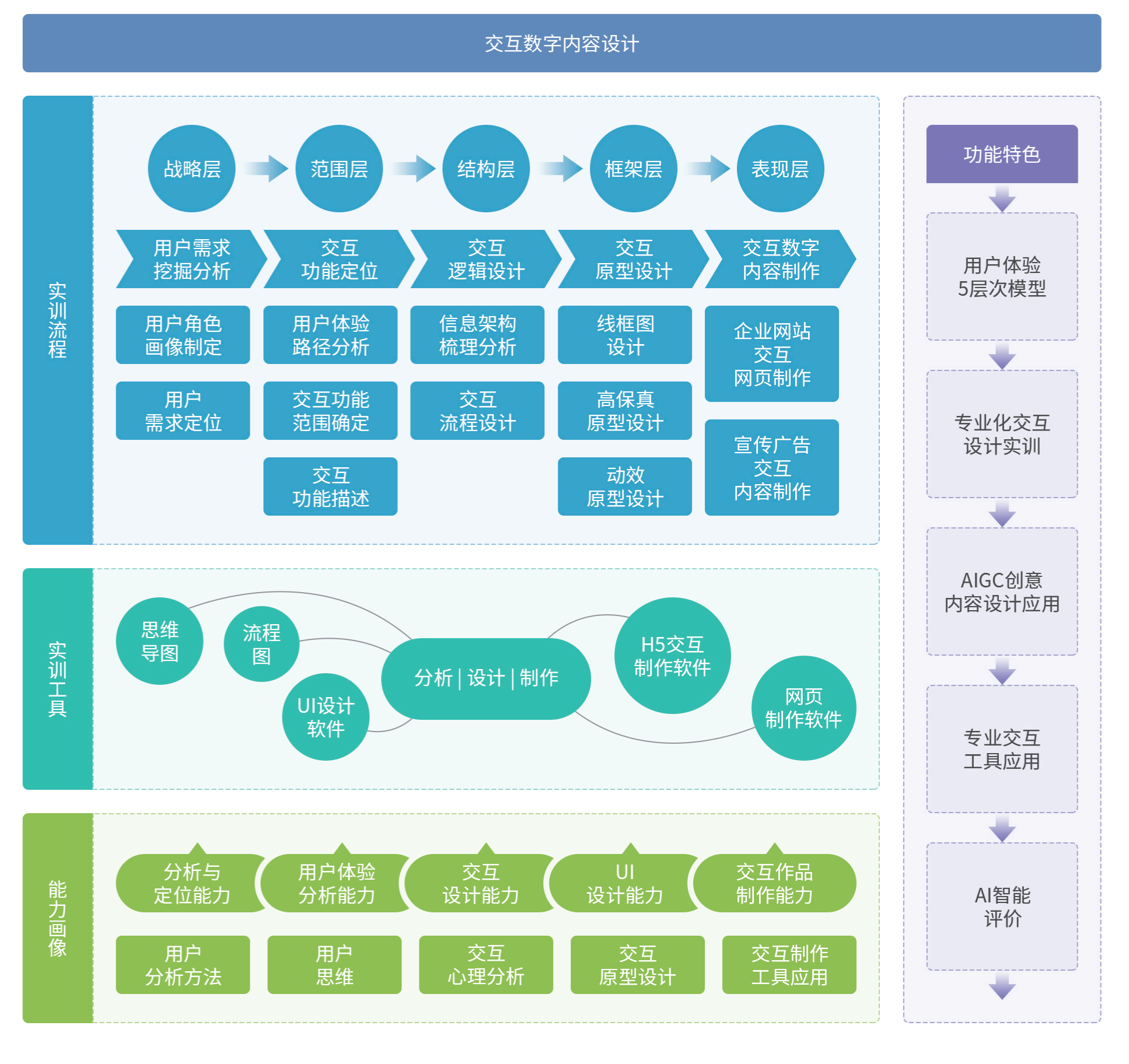 交互数字内容设计实训是以用户交互体验的五层次模型为线索,致力于打造专业化、前沿化的内容创作生态,构建了一套完善的交互数字内容技能体系,涵盖了从交互设计的需求分析、功能定位、逻辑设计、原型设计到最终不同场景交互内容制作落地的一站式全流程实训框架,其中包括深入细致的UI及交互设计环节,以及高效的作品制作与落地实施步骤。