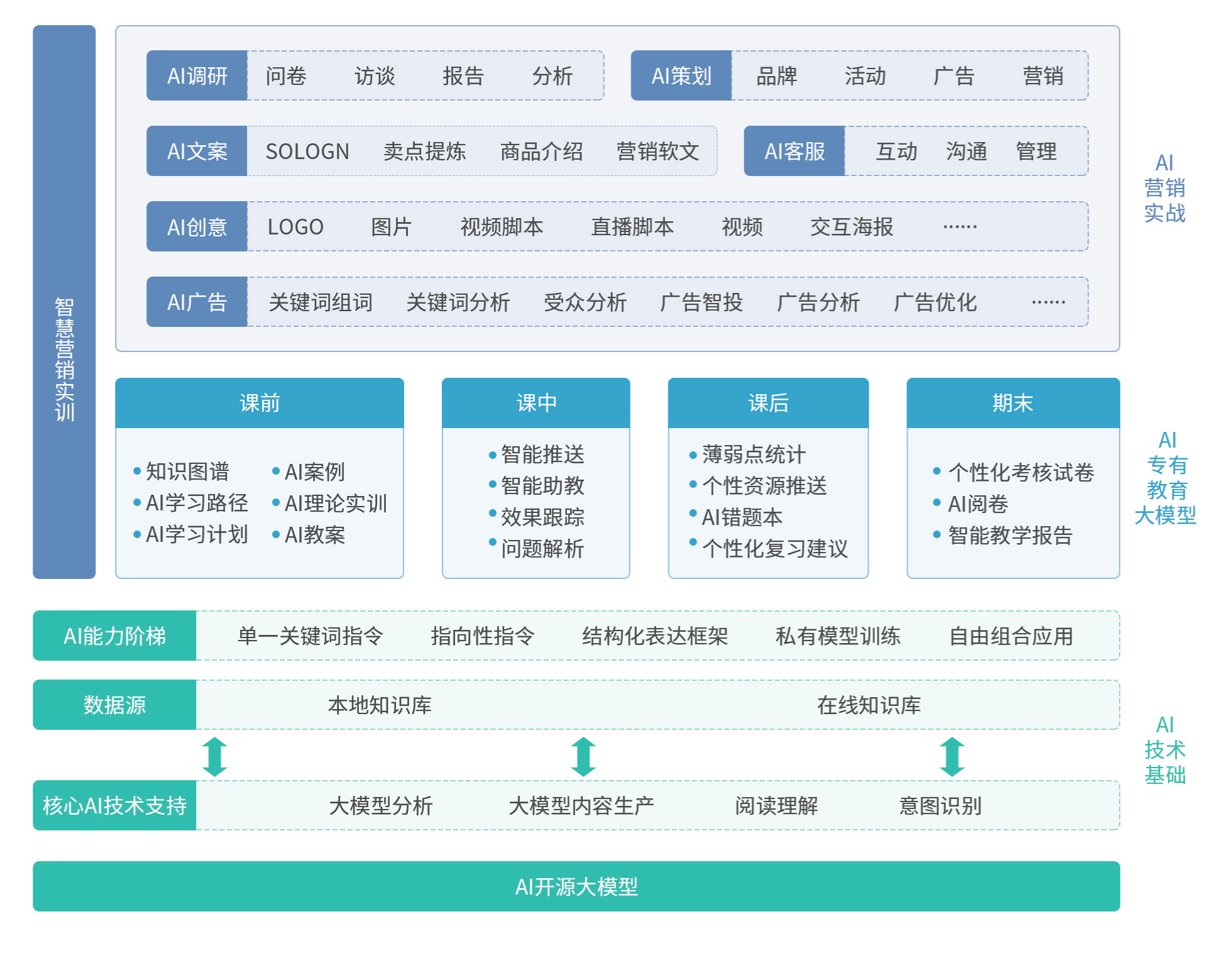 AI营销实验旨在培养学生的AI营销技能和创新应用能力,实践内容涵盖了AI调研、策划、文案、创意和广告等多个环节的典型工作任务,让学生体验AI营销技术对市场营销全过程的赋能。在实验过程中,学生需要掌握运用AI调研进行市场动态和消费者心理分析并制定策略方案;需要根据营销目标利用Al进行文案创作和视觉设计;需要借助Al技术完成广告推广过程中的关键词分析、受众研究与广告效果分析与优化;需要利用AI工具提高客户服务的效率与效果。除此之外,实验过程注重引导学生探索更广阔方向的AI营销创新性应用,服务于AI工具在市场营销领域的落地,全面提升学生在市场营销各个环节,利用AI技术进行实践与创新的能力,为未来的职业发展奠定坚实的基础。