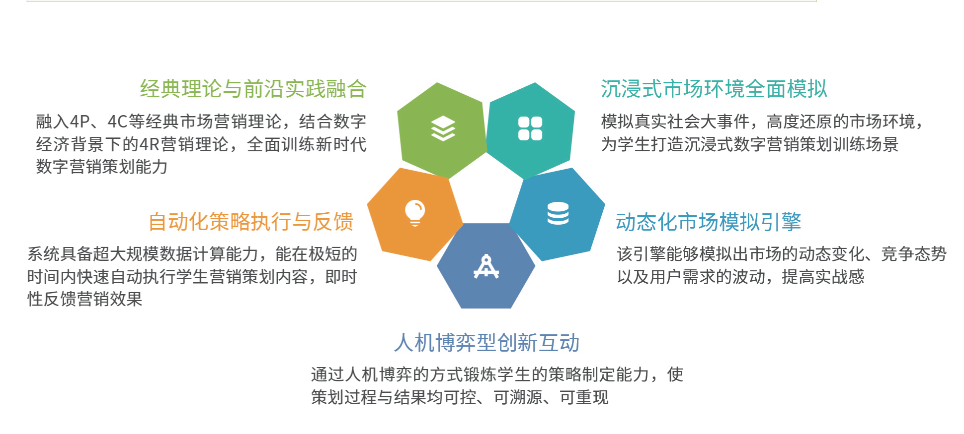 数字营销决策实验将数字经济背景下的4R营销理论融入其中,立足企业的营销数字化转型,结合真实的社会大事件以及市场动态数据,构建一个以数字营销决策为核心的综合实验沙盘实验环境。实验过程中,学生在一个动态变化的市场环境中,通过人机博弈的方式完成市场分析、目标人群画像分析、数字广告营销策划、产品销售策划、促销活动策划、客户关系管理等方面数字营销策略的制定。沙盘系统根据学生的策略情况自动执行营销活动并反馈营销效果数据,通过营销效果数据衡量学生的数字营销策划能力。同时,学生根据营销效果数据发现问题、分析问题,并通过营销策略的调整解决问题,最终为企业带来最大的品牌效应与销售收益。通过实验,学生能够在实践中理解和应用数字营销理论,将具备市场分析、决策制定和问题解决的能力,并能够适应不断变化的市场环境,为企业带来创新和增长。