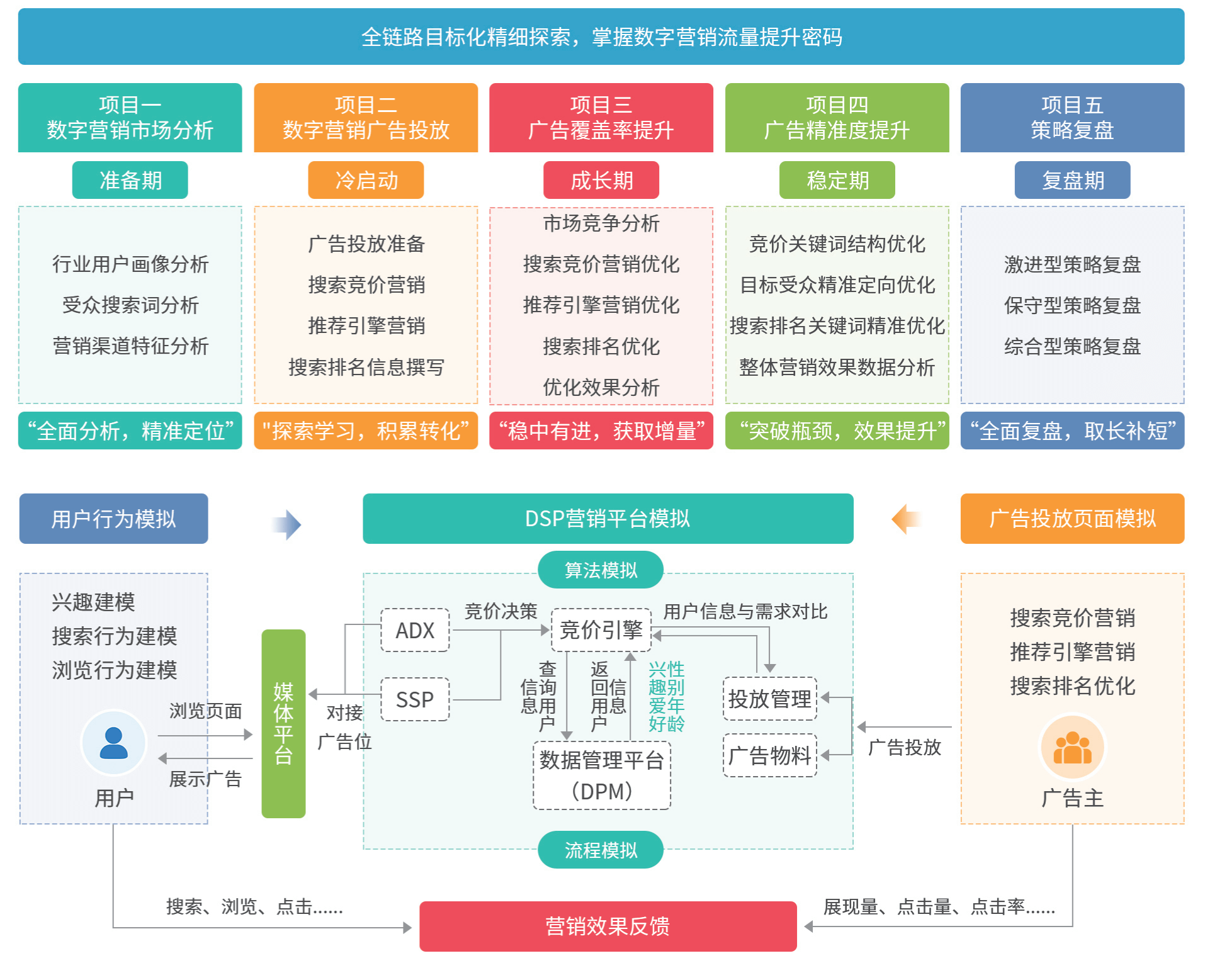 数字营销综合实验以DSP平台为依据,定位于搜索和推荐两大数字营销工作领域,要求学生应用主流媒体平台的数字营销技术,通过一“推”一“拉”两种营销方式将企业信息分别传送给无意浏览和有意搜索的目标受众群体,完成企业官网、移动应用程序、线下门店等多种场景的数字营销工作,解决数字经济时代的品牌认知问题。实验过程中,学生依托高度还原营销真实数字营销平台算法的实验平台,按照连续三个闭环推广周期螺旋式营销目标上升的思路设计,完成数字营销市场分析、数字营销广告投放、广告覆盖率提升、广告精准度提升、营销实战复盘五个项目的实验任务,实验平台实时、全面、动态化反馈学生营销效果数据,量化衡量营销效果的同时辅助学生分析竞争优势与不足,并不断优化营销过程,提高营销效果。