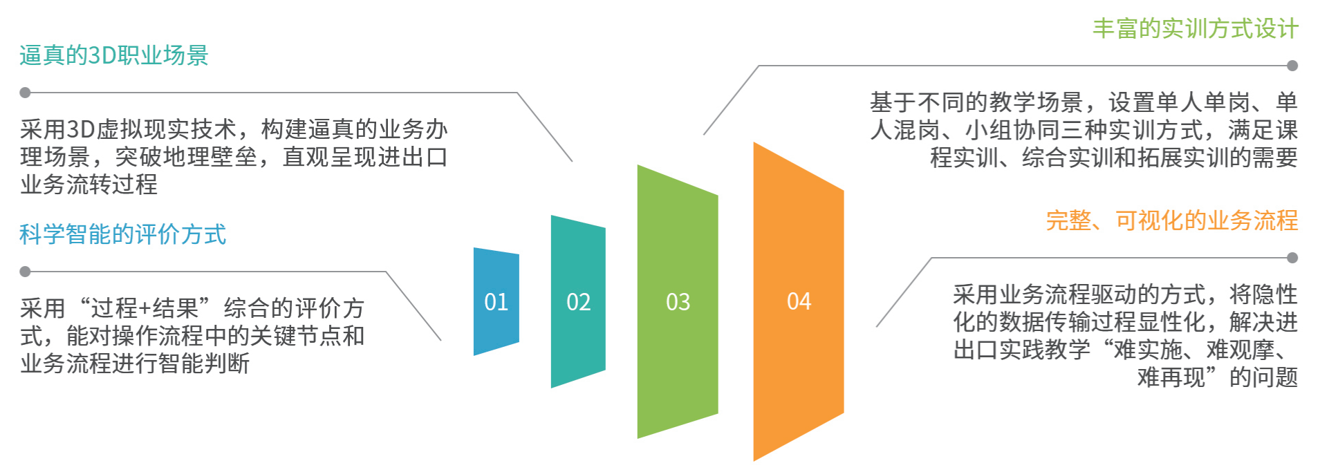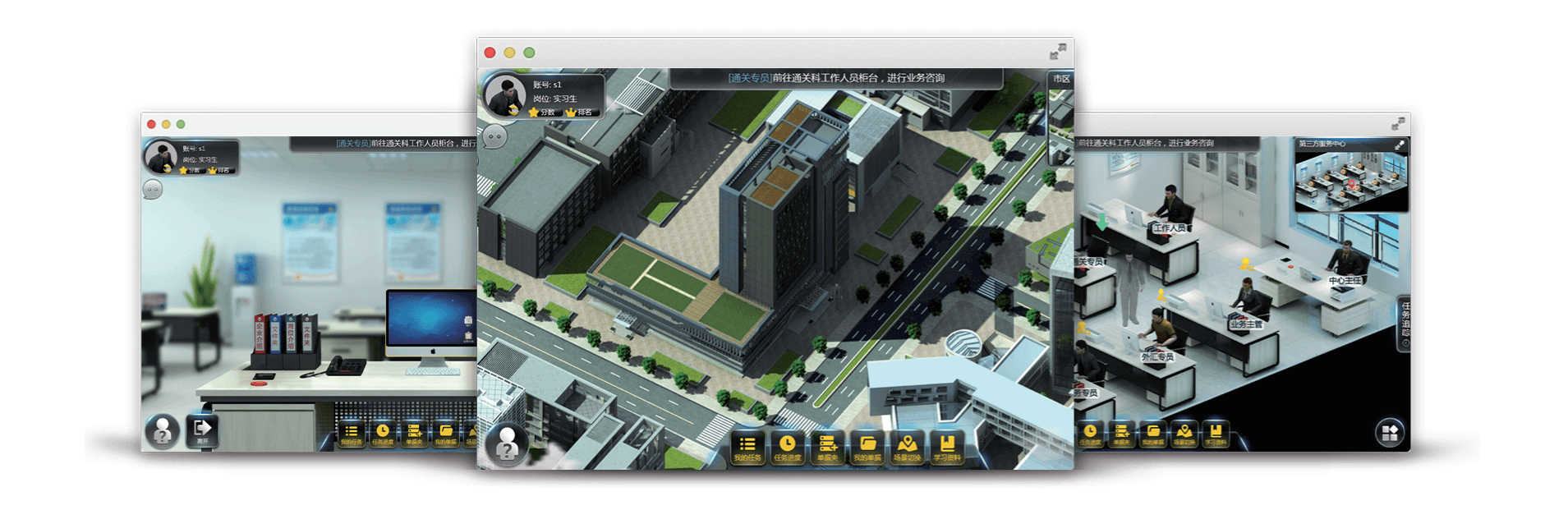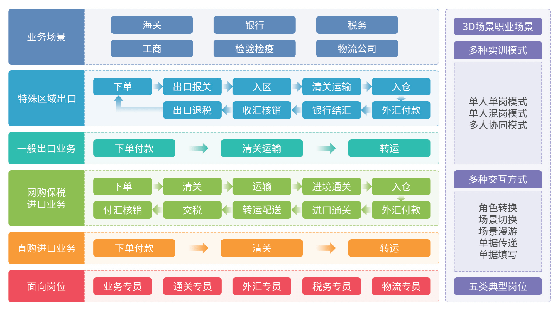 跨境电商通关实训利用3D虚拟现实技术,按照跨境电子商务企业进出口真实业务处理的需求搭建海关、银行、税务、工商、检验检疫、物流公司等3D场景。基于跨境电子商务零售进出口9610、1210两种主要的监管方式和跨境电商进出口最新国家政策,立足进出口两个角度,采用典型工作任务流程驱动的方式,让学生利用角色转换、上岗操作、场景切换、单据填写、信息查询、签章等功能,完成业务专员、通关专员、外汇专员、税务专员、物流专员等五个工作岗位的实训任务。并基于不同的教学场景设置单人单岗、单人混岗、小组协同三种实训模式。通过场景化、沉浸式的模拟训练,培养学生的跨境电商合规通关意识,提高学生进出口通关业务处理能力。