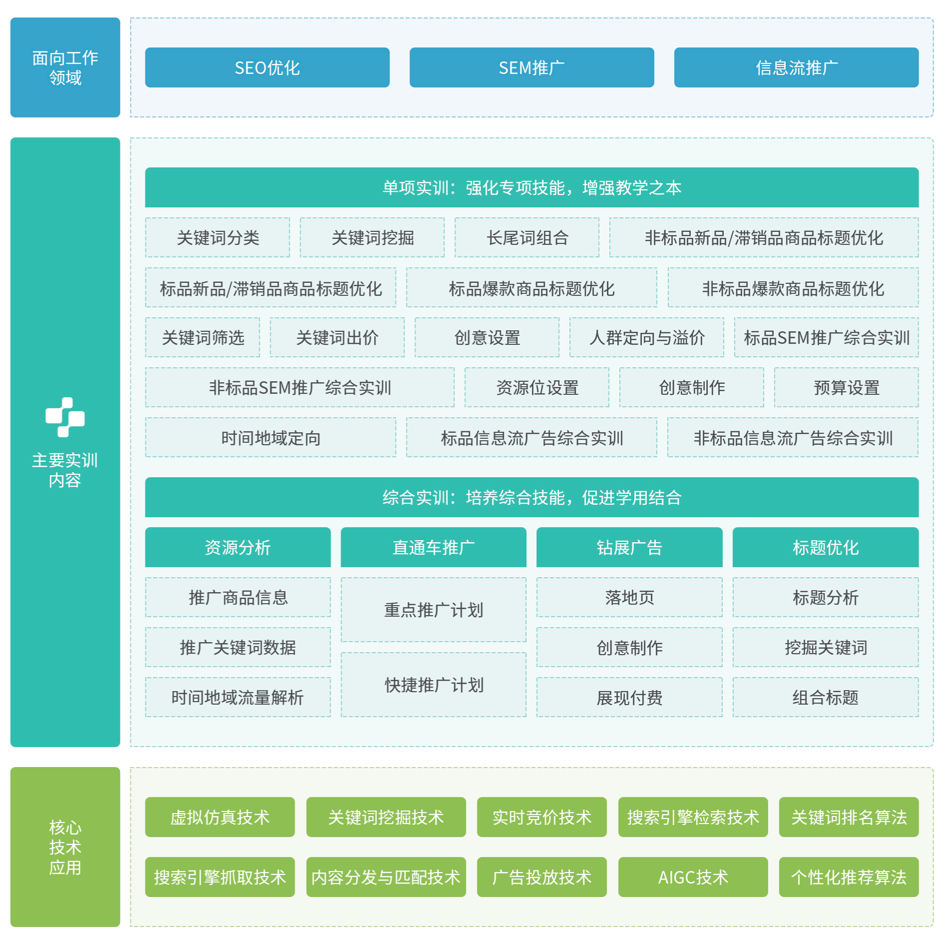 跨境电商推广实训主要面向海外推广岗位(群),聚焦跨境电商搜索引擎和推荐引擎技术应用场景下SEO优化、SEM推广、信息流推广三项就业领域。利用人工智能和大数据技术构建逼真的跨境电子商务推广环境和闭环的推广效果评价机制,采用“专项技能实践+综合应用提升”的组合实训方式,打造集静态推广环境下关键技能训练和动态推广环境下综合技能高效应用的综合性实训平台。全面培养学生的数字营销技术应用能力、推广方案策划能力、SEO优化能力、SEM推广能力、信息流推广能力,提高流量获取和转化的经济效益。
