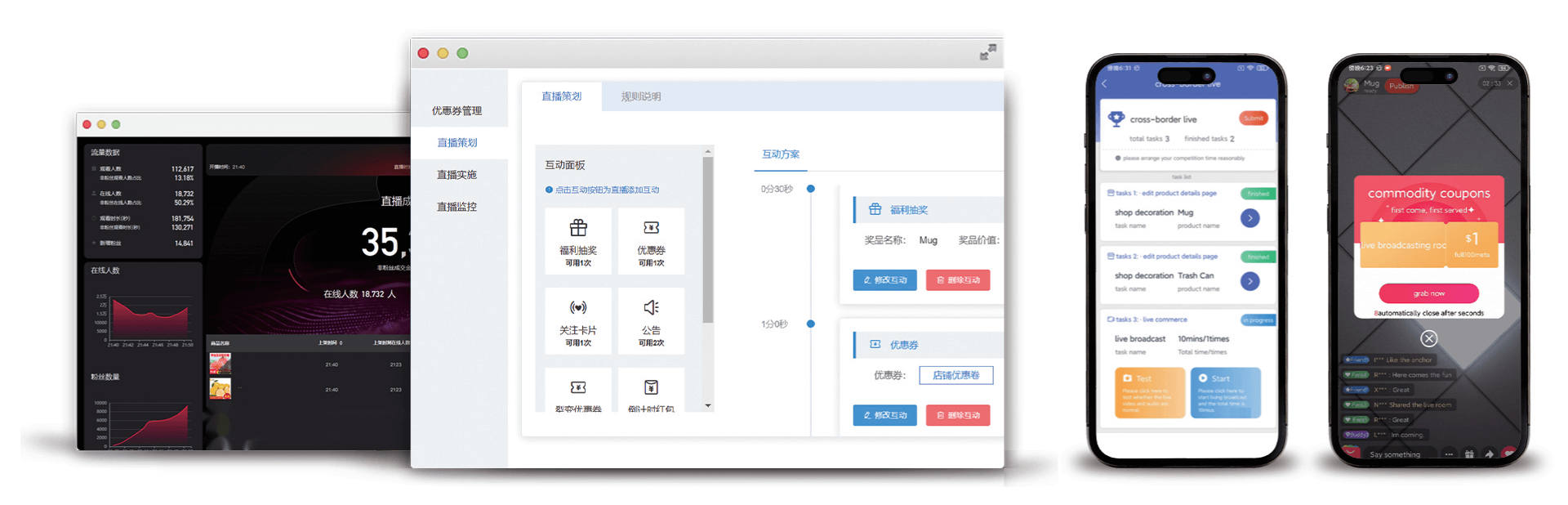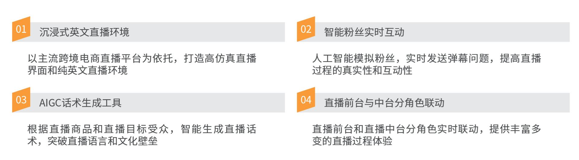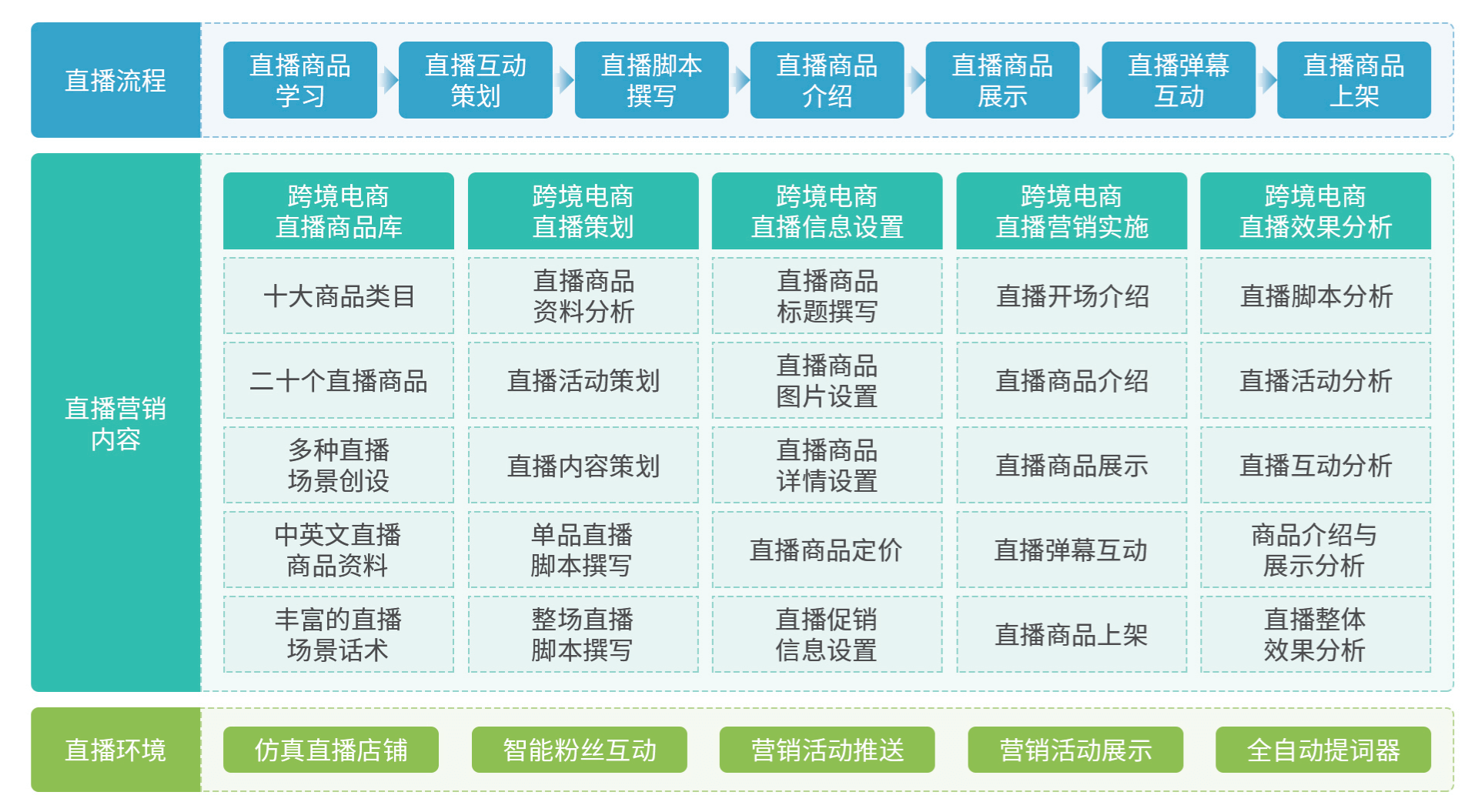 跨境电商直播营销实训面向跨境电商直播岗位(群),紧跟跨境电商直播发展风向,以典型跨境电商直播平台为蓝本,聚焦跨境电商直播策划、直播运营、直播带货三大工作领域,根据不同工作内容特性,利用人工智能和虚拟仿真技术设计不同的实训方式。遵循积木搭建逻辑,基于直播实施流程内置多种互动场景、多种风格的讲解话术,突破跨境电商直播语言和文化壁垒。通过逼真的直播前台、中台工作环境构建,培养兼具直播策划能力、直播运营能力和直播营销能力的高素质综合型跨境电商直播人才。