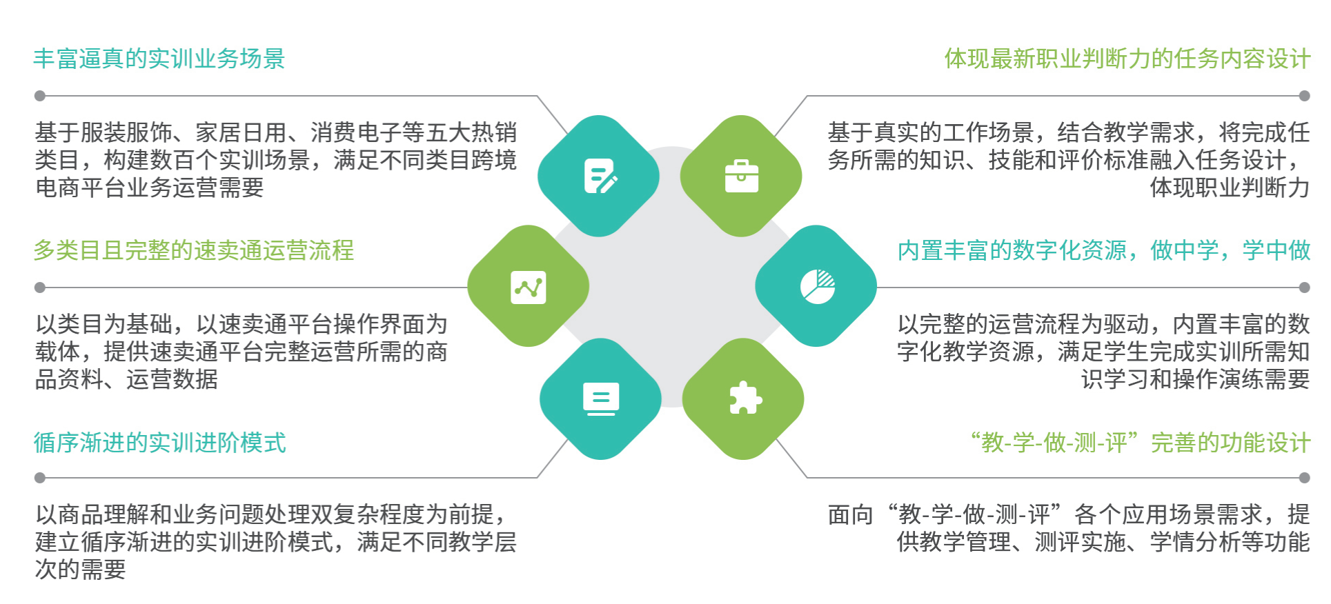 速卖通平台运营实训主要面向跨境电商运营岗位(群),以全球速卖通平台为蓝本,聚焦服装服饰、家居日用、消费电子、箱包等速卖通平台热销类目,借助大数据和人工智能技术,全真模拟速卖通平台各项功能和界面,采用任务驱动、数据引导的方式进行实训内容设计,全面培养学生的店铺管理能力、商品发布与优化能力、营销策划能力、平台推广能力、订单管理能力、客户沟通能力、运营数据分析能力。助力既懂行业专业知识,又懂速卖通平台运营规则和技巧的高端复合型应用人才的培养。