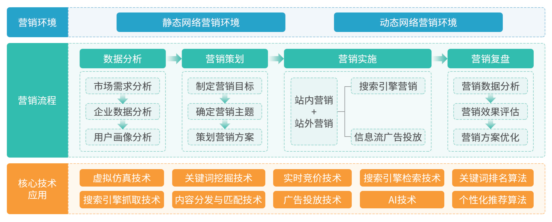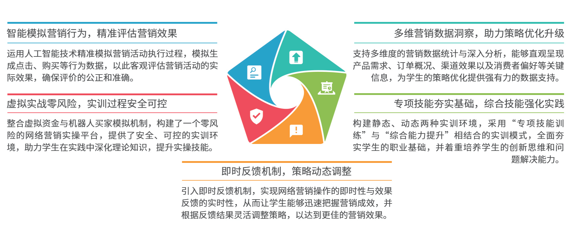 网络营销实训聚焦站内营销和站外营销应用场景下搜索引擎营销、信息流广告投放等核心环节,利用人工智能技术模拟真实网络营销平台的决策情境,智能生成竞争对手数据,构建了一个全面且动态的网络营销决策环境。采用“专项技能实践+综合应用提升”的组合实训方式,打造集静态网络营销环境下专项技能实践探索和动态网络营销环境下综合技能高效应用的综合性实训平台。通过实践,学生能够了解不同市场竞争环境下网络营销的基本业务逻辑,为以后从事网络营销相关工作打下坚实基础。
