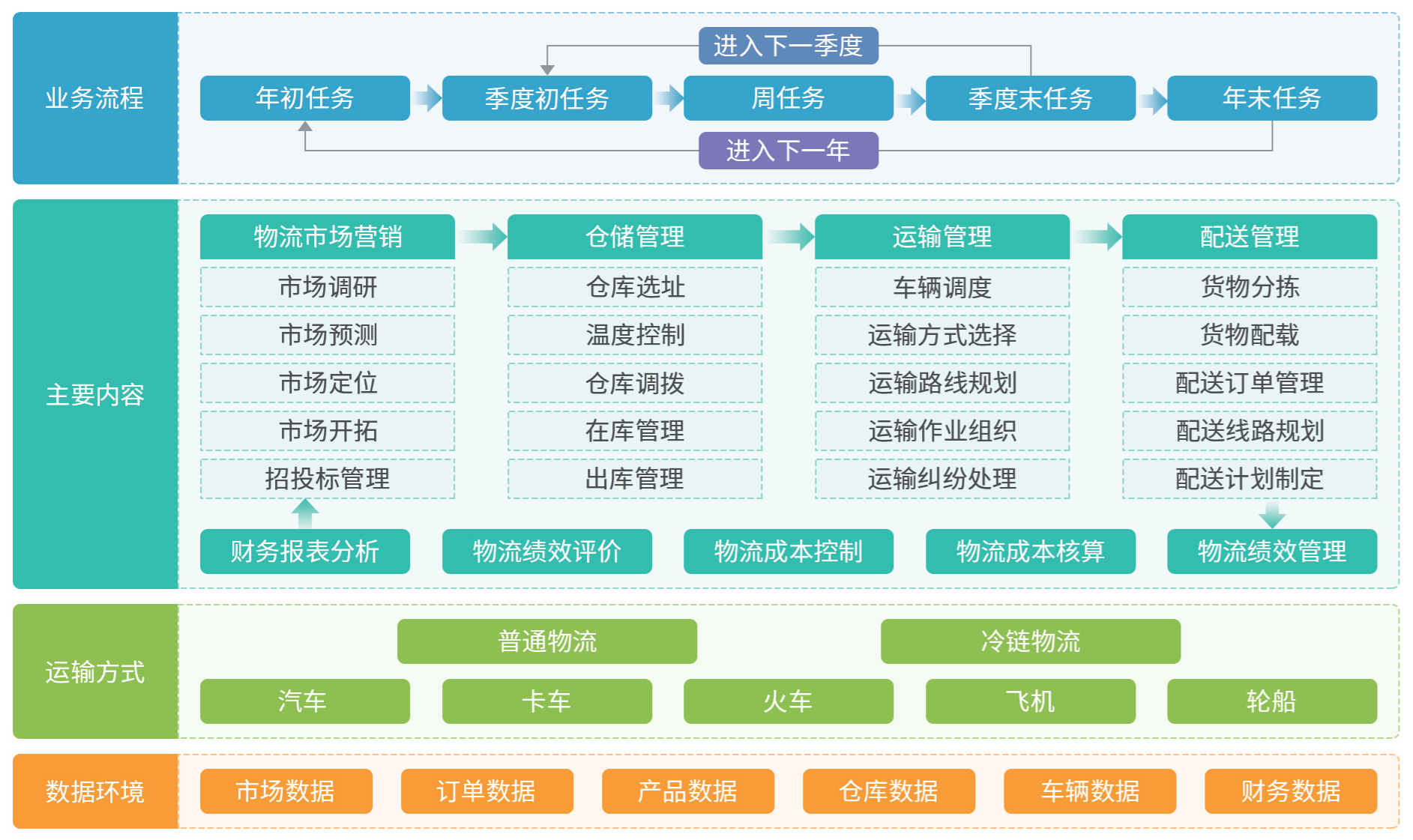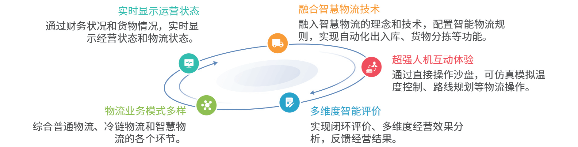 智慧物流管理沙盘实训以实践导向、技能培养、问题解决和零和博弈为设计理念,立足第三方物流企业,在给定的初始运营资金前提下,利用智慧物流技术不断为有物流业务需求的客户提供普通物流、冷链物流服务。通过连续多轮模拟物流企业物流市场营销、仓储管理、运输管理、配送管理等主要业务领域的关键业务操作流程,获得宝贵的实践经验,掌握物流管理的基本技能和操作流程,提高物流决策和战略规划能力,增强对突发事件的快速反应和处理能力,同时鼓励不断探索和创新物流解决方案,提高物流企业经营能力。